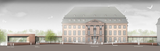 Neben der Sanierung des Deutschhauses sieht der Entwurf unter anderem einen zurückhaltenden, modernen Anbau und eine neue Eingangsplattform vor. Diese wird als Treppen- und Rampenerschließung dem Deutschhaus vorgelagert. In ihrer symmetrischen Ausformung nimmt sie Bezug zum historischen Bestand und dient als verbindendes Element zwischen den Anbauten.