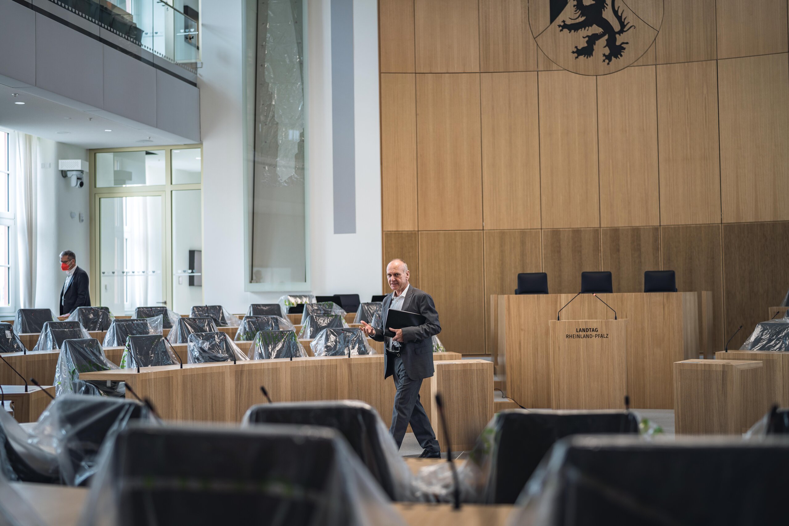 Der Plenarsaal erhielt eine neue Möblierung sowie eine barrierefrei erreichbare Tribüne für Presse und Besucher. Die historische Hambacher Fahne, die das Landtagsgebäude seit 1954 schmückt, wurde so in den Neubau integriert, dass sie die identitätstiftende und demokratische Wirkung des Ortes unterstreicht. Mit exakt 111 Zuschauerplätzen und einer Fläche von rund 150 m² ist der neue Plenarsaal um einiges größer als der vorherige Saal.