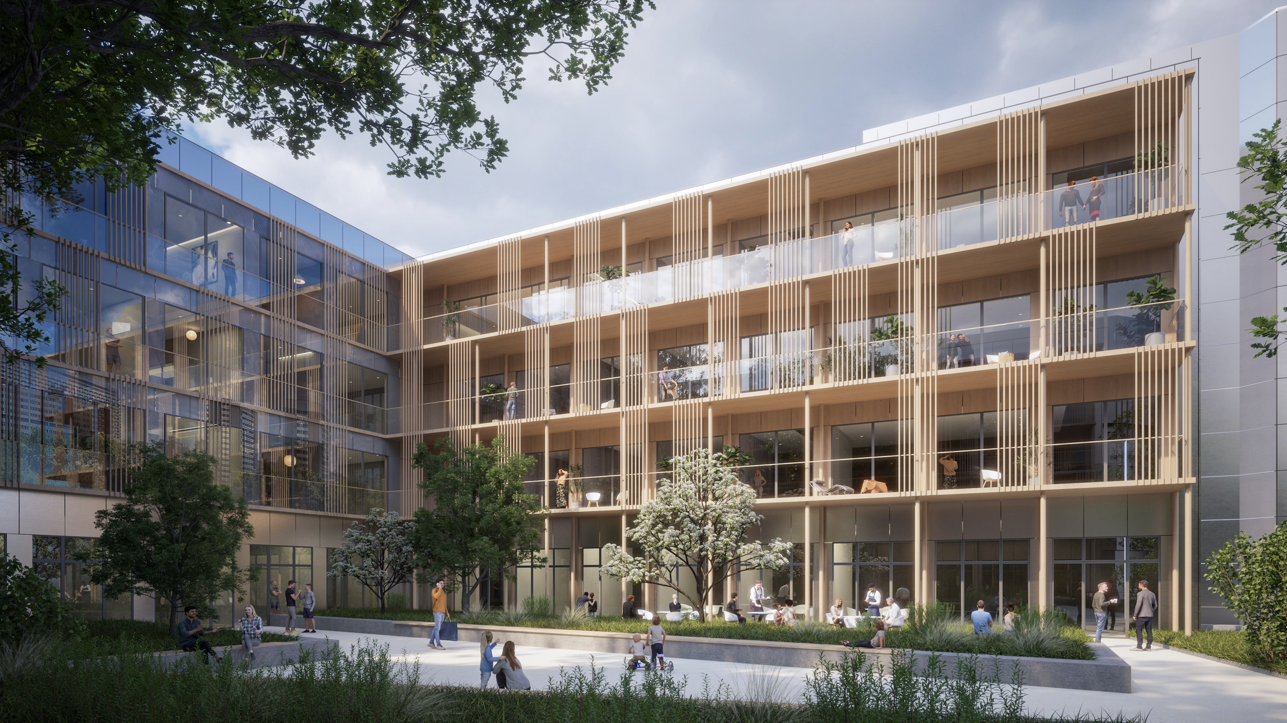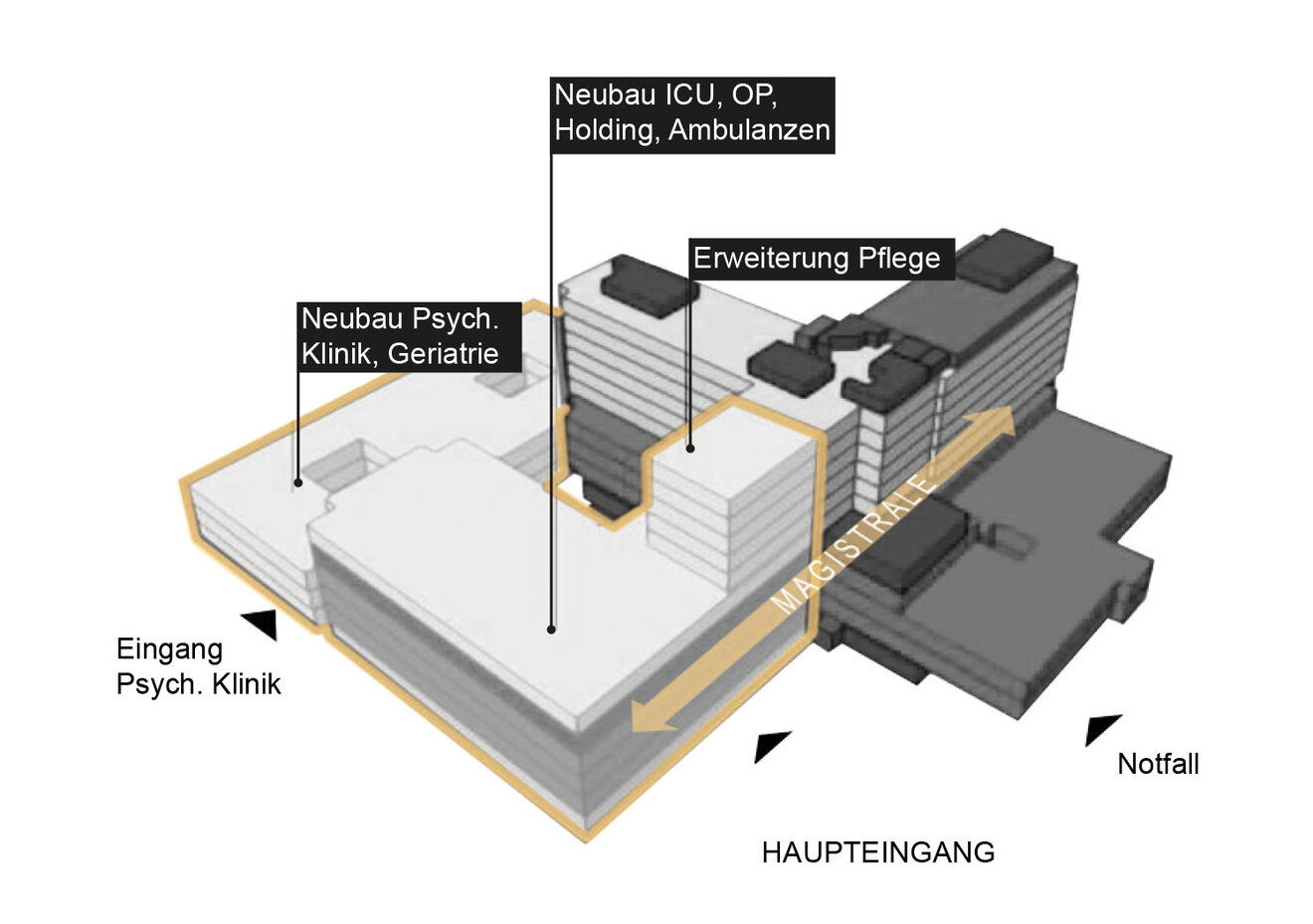 Abbildung 2: Anhand dreidimensionaler Darstellungen wird anschaulich dargestellt, welche Nutzungen sich künftig in welchem Gebäudeteil befinden sollen. Dabei wird zwischen Bestand- und Neubauten unterschieden.