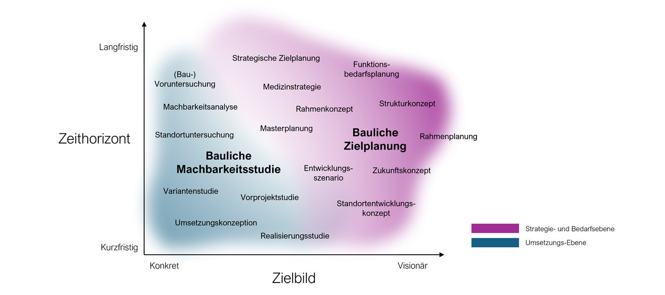 Abbildung 1: Die Begriffe „Bauliche Machbarkeitsstudie“ und „Bauliche Zielplanung“ sind nicht trennscharf und werden durch eine Reihe von synonym verwendeten Begriffen begleitet.