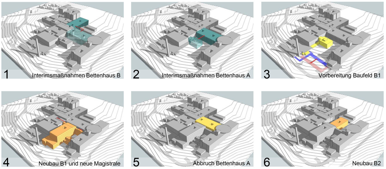 Diese Studie analysiert die baulichen Möglichkeiten im Bestand und bewertet Varianten zwischen Sanierung, Teilabriss, Aufstockung, Erweiterung oder auch vollständigem Ersatzneubau. Im Mittelpunkt stehen dabei die Substanzbewertung (z. B. Statik, Raumzuschnitte, Erschließungssysteme, TGA, Denkmalschutz) sowie die organisatorische Umsetzbarkeit im laufenden Betrieb. Auch Interimsstrategien und logistische Szenarien werden in die Betrachtung einbezogen.
