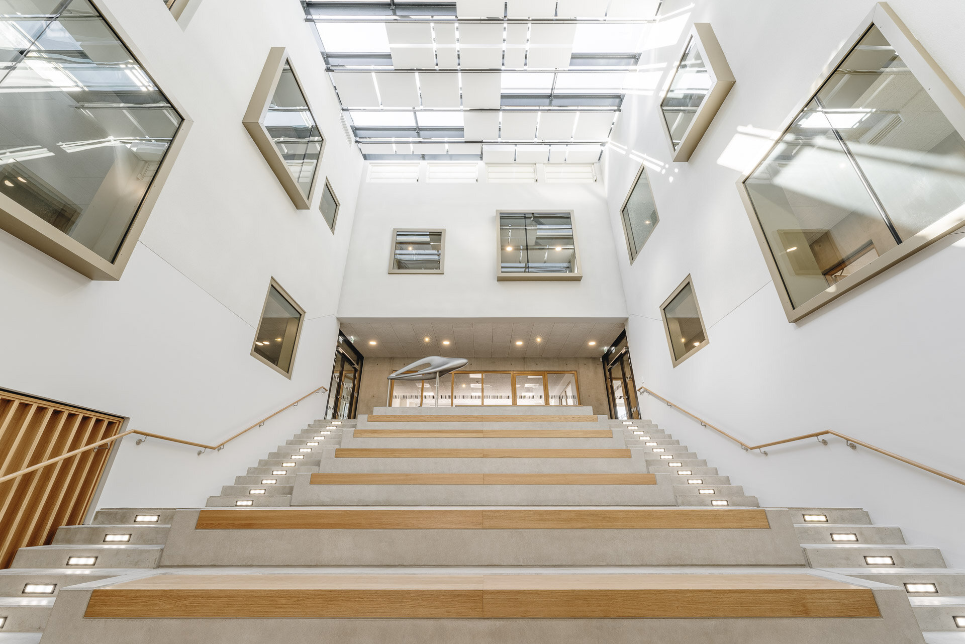 Als Ort der Bildung müssen Schulbauten soziale Interaktionen fördern und bereits als Gebäude Vorbildcharakter haben. Untersuchungen aus der architekturpsychologischen Forschung zeigen, wie beispielsweise Farbigkeit und Materialität von Decke, Boden und Wand oder die Raumgeometrie auf menschliches Befinden und soziale Interaktionen wirken³. Ein konkretes Beispiel ist die Lichtplanung: Beleuchtungssysteme in Kombination mit entsprechender Raumgestaltung und Möblierung können hinweisgebend für spezifische Raumnutzungen eingesetzt werden und betonen beispielsweise Bereiche im Raum zum Zusammenkommen, Essen oder konzentrierten Arbeiten. Durch die Gestaltung des Raumes wird die beabsichtigte Raumnutzung intuitiv vermittelt.