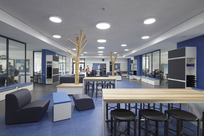 Hierbei lösen sich Klassenzimmer und Fachräume zu „Lernräumen“ auf, indem eine Raumlandschaft entsteht, in der verschiedene Nutzungen – beispielsweise für allgemeine oder fachspezifische Lernphasen, Ganztagsangebote, Inklusion und Personalisierung fließend ineinander übergehen.