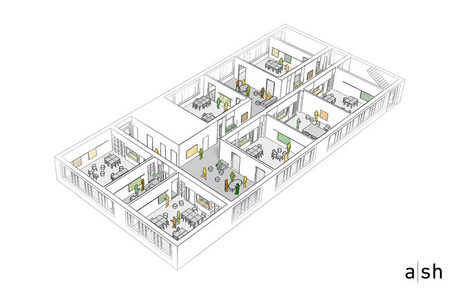 Basierend auf jahrelanger Erfahrung im Bereich Bildungsbau unterschiedlicher Pädagogik, Schulart und Bauen im Bestand decken a|sh architekten neben der Projektumsetzung der Leistungsphasen 1 bis 9 verschiedene Schwerpunkte ab. Dazu gehören Machbarkeitsstudien und Wirtschaftlichkeitsberechnungen, Entwicklung und Beratung bei der Erstellung von förderfähigen Raumprogrammen mit Funktionsorganigramm, pädagogische Architektur auf Basis der Durchführung der sogenannten „Phase Null“, kontinuierliche Nutzerbeteiligung und Schulbauberatung sowie die Bearbeitung von Wettbewerben. Teil der Projektentwicklung ist zusätzlich die Erarbeitung von Gebäudekonzepten verschiedener Art: Energiekonzepte, Barrierefrei-Konzepte und spezifische Brandschutzkonzepte für offene Lernraumkonzepte.
