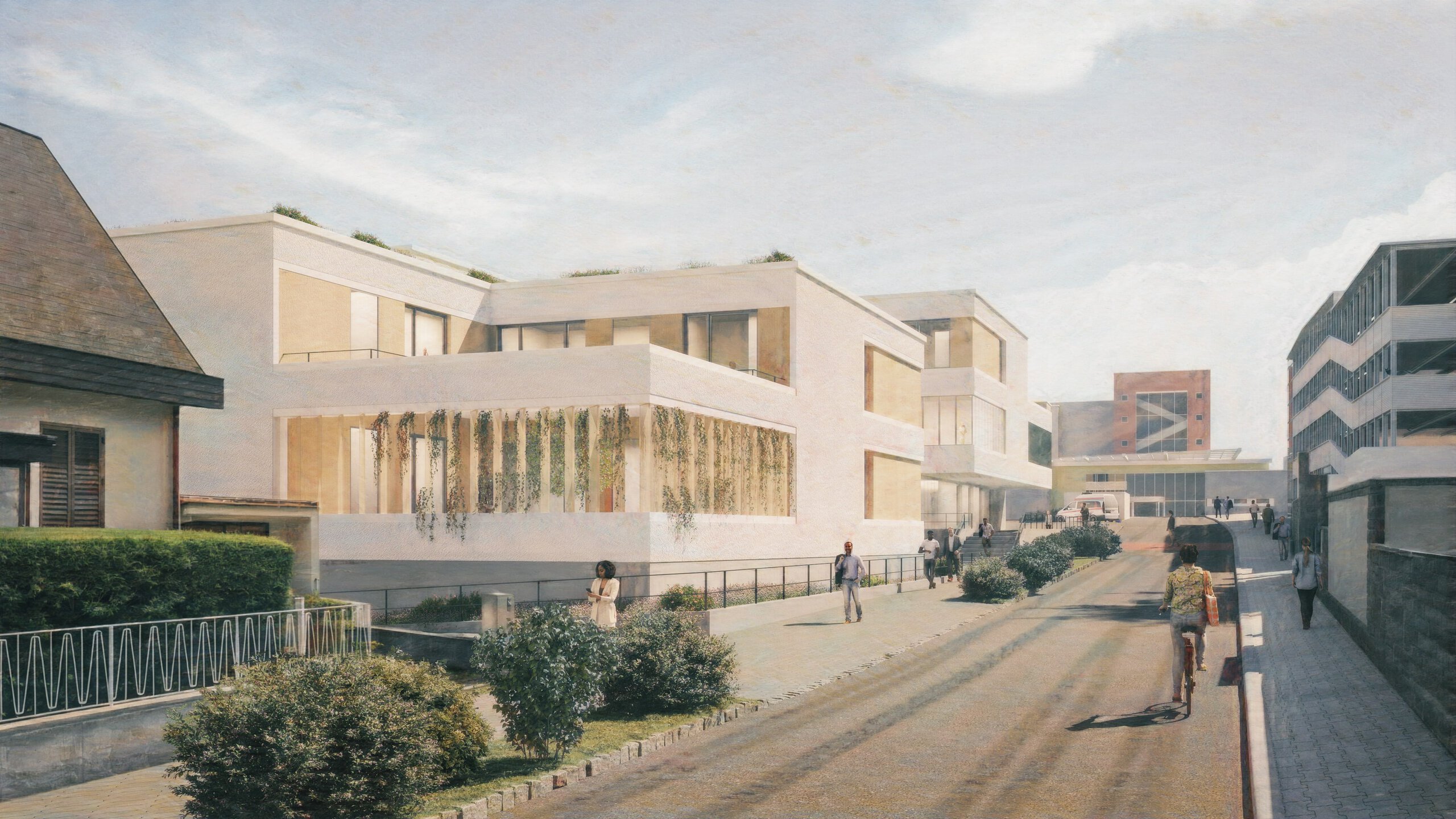 Der Planungsvorschlag soll sich harmonisch in das umgebende Stadtgefüge integrieren und als Vermittler zwischen verschiedenen städtebaulichen Strukturen fungieren. Die funktionsbezogene Verteilung innerhalb der Psychiatriegebäude ermöglicht eine effiziente und gezielte Nutzung der Räumlichkeiten, um den Anforderungen der verschiedenen Behandlungs- und Therapiebereiche gerecht zu werden. Der architektonische Entwurf des Neubaus verbindet innovative Konzepte mit funktionalem Design, wobei besonderes Augenmerk auf die Flexibilität und Anpassungsfähigkeit der Räume gelegt wird. Die ästhetische Gestaltung des Entwurfs zielt darauf ab, eine harmonische Integration in die umgebende Landschaft zu erreichen und gleichzeitig eine einladende und beruhigende Atmosphäre zu schaffen, die zur Genesung der Patient:innen beiträgt.