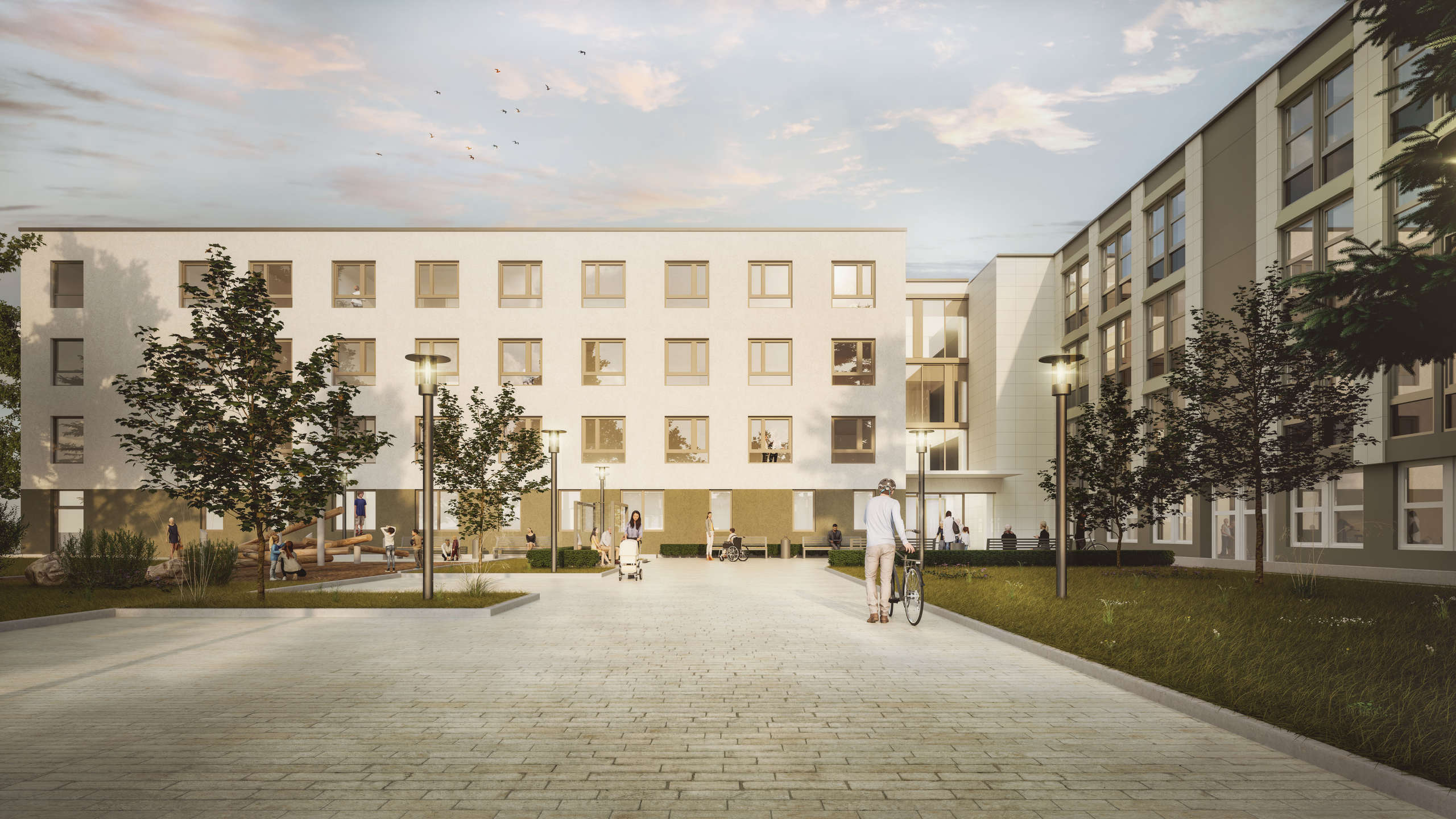 Der Neubau umfasst drei Stationsebenen für neurologische und gerontopsychiatrische Bereiche mit 59 Patient:innen sowie Patientenaufnahme, Radiologie und Labor. Im Anschluss wird das Bestandsgebäude zur Frührehabilitationsstation umgebaut.