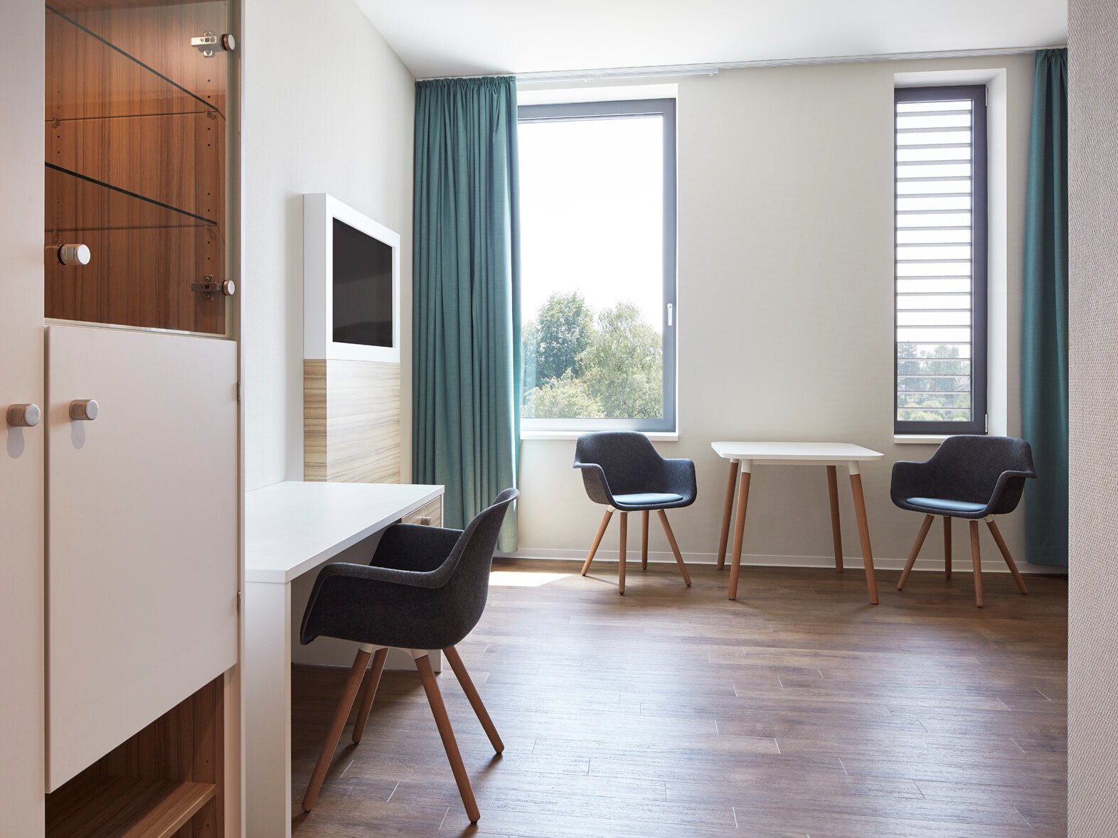 Die Klinik Königshof gehört zum Verbund der St. Augustinus-Kliniken. Sie ist Fachkrankenhaus für Psychiatrie, Psychotherapie und Neurologie. Der dreigeschossige weiße Neubau mit zentralem Innenhof ergänzt den historischen Altbau. Baukörper und Erschließung sind so konzipiert, das zukünftige Erweiterungen möglich sind. Insgesamt 80 Patienten können in den Zimmern mit moderner Ausstattung betreut und behandelt werden.