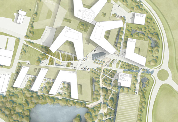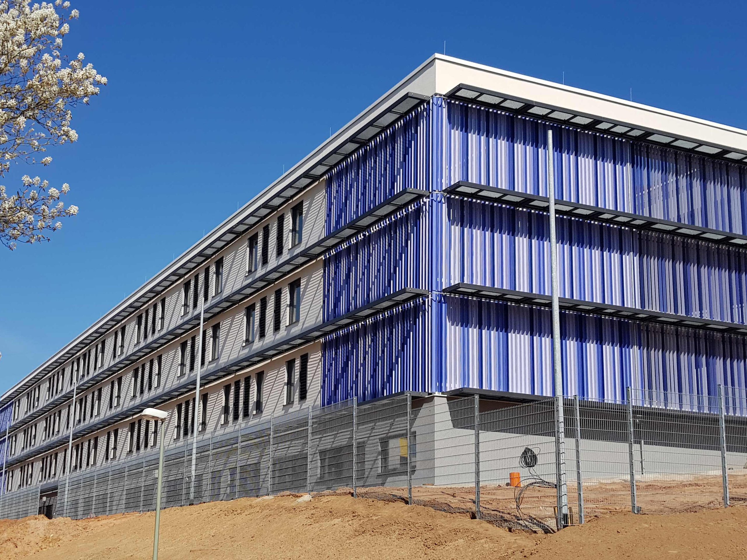 Die neuen Stations- und Pfortengebäude nutzen geschickt die Hanglage und ordnen mehrere Funktionen nachhaltig und flexibel. Trotz der hohen Sicherheitsmaßnahmen wirken die Stationen wohnlich. Die Freihöfe sind auf den Stationen jeweils an den Gebäudeenden integriert. Auf einer Grundsteintafel aus blauem Beton im Pfortengebäude der Klinik, die im März 2017 vom Minister für Umwelt und Verbraucherschutz Rheinhold Jost enthüllt wurde, steht geschrieben: „Die Würde des Menschen ist unantastbar“. Die Tafel wurde von der Designerin Eva Rusch und dem Bildhauer Jörg Wagner gestaltet. Dieser Grundsatz floss in die Architektur von a|sh architekten ein.