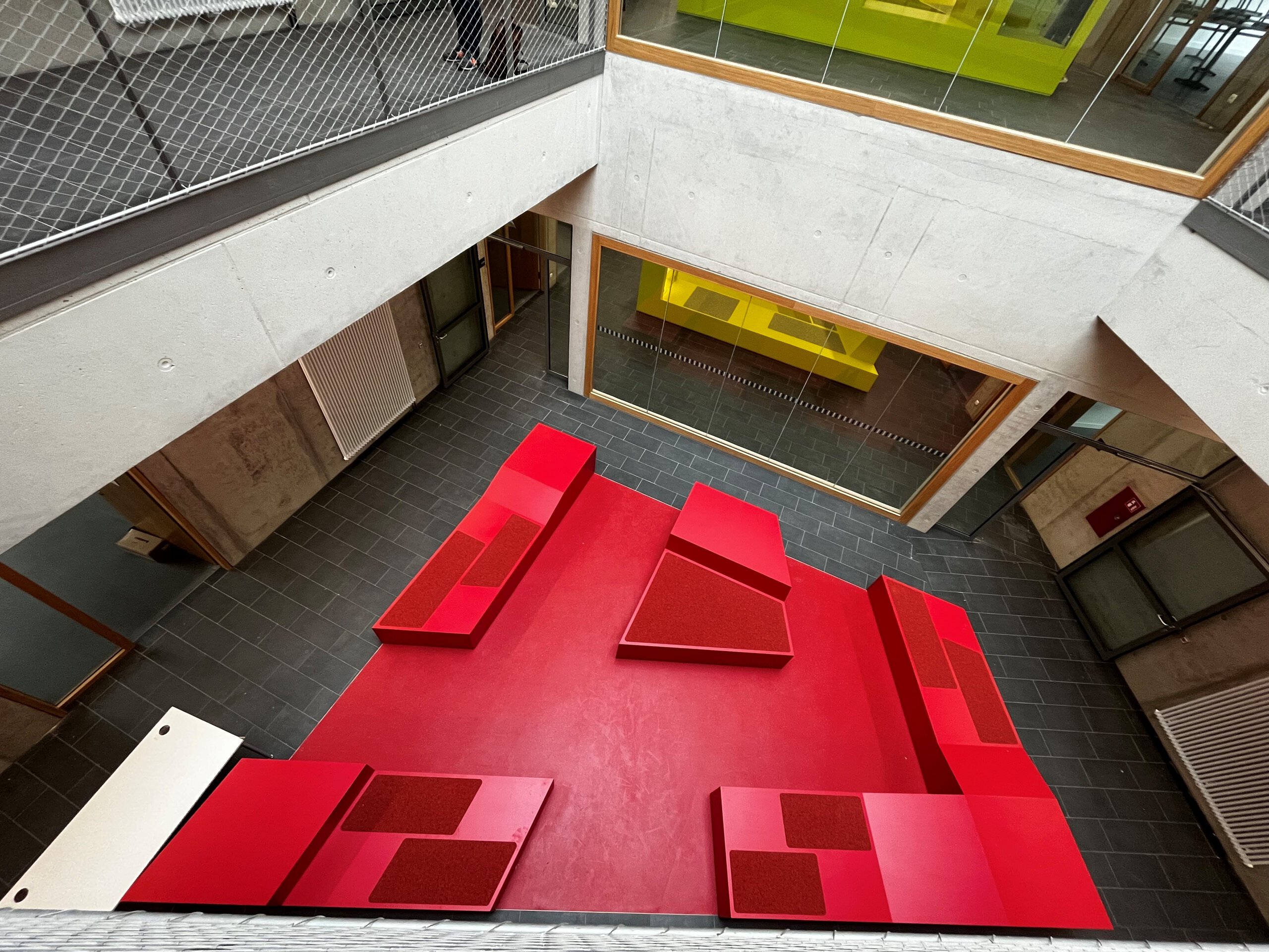 Die Funktionsbereiche Unterricht, Aula und Verwaltung wurden neu geglieder. Herzstück bildet die lichtdurchflutete Eingangshalle mit Sitztreppe - sie bildet den neuen gemeinschaftlichen Mittelpunkt und Aufenthaltsort.