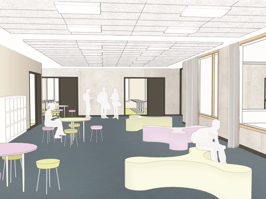 Mit dem Neubau ist ein neues Schulensemble entstanden, welches die Bedürfnisse der Schule abbildet. Sowohl traditionelle Klassenräume, als auch offene, vielfältig nutzbare Flächen stehen den Schülern und Lehrern als neue Lernorte zur Verfügung. Hier werden zukünftig verschiedene moderne Unterrichtsformen - allein, zu zweit, in der Gruppe mit differenzierten Lernsituationen stattfinden.