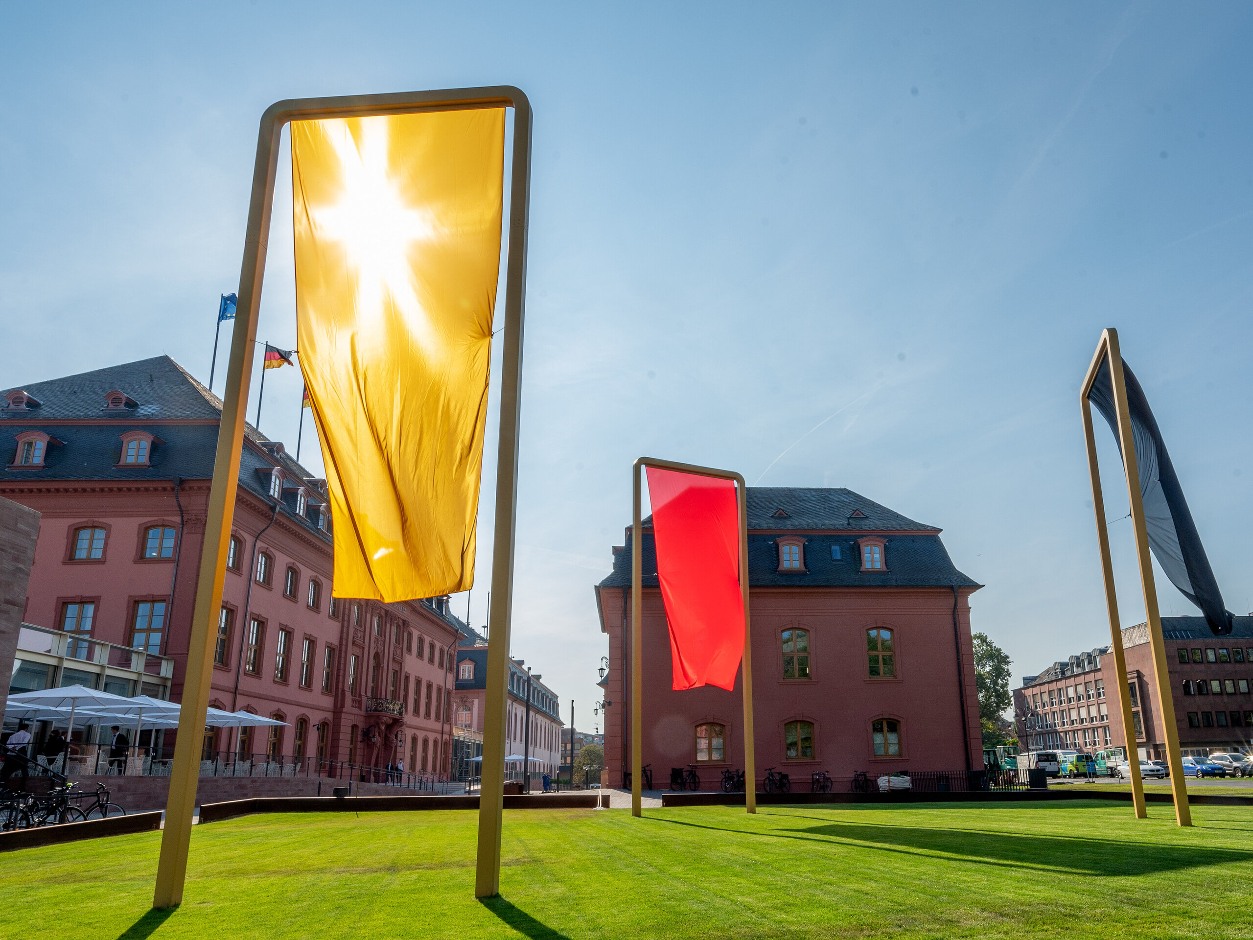 Der Landtag in Mainz ist eröffnet und mit ihm auch das Kunstwerk „Drei Farben“ von Künstler Michael Sailstorfer. Drei Fahnen in den Farben der deutschen Flagge wehen vor dem Deutschhaus auf einer großen Rasenfläche auf dem Platz der Mainzer Republik.