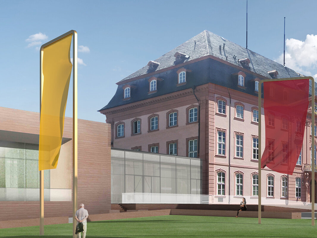 Die Aufgabe für die Kunst lautete, den rheinland-pfälzischen Landtag als besondere Stätte der Demokratie darzustellen. Gewünscht war, dass das Kunstwerk Anlaufstelle für die vielen Landtagsbesucher ist und sich sensibel in die städtebauliche Situation einfügt. Mit dem Siegerentwurf von Michael Sailstorfer soll der Besucher eingeladen werden, über den Ort und seine Bedeutung nachzudenken. Die „Drei Farben“, wie der Künstler seinen Entwurf nennt, ist eine Torskulptur auf grüner Rasenfläche. Abgeleitet aus der Hambacher Fahne, deren Original nach der Landtagssanierung wieder im Plenarsaal hängen wird, entwickelt er auf dem Platz vor dem neuen Anbau drei große Tore mit einer schwarzen, roten und goldenen Fahne.