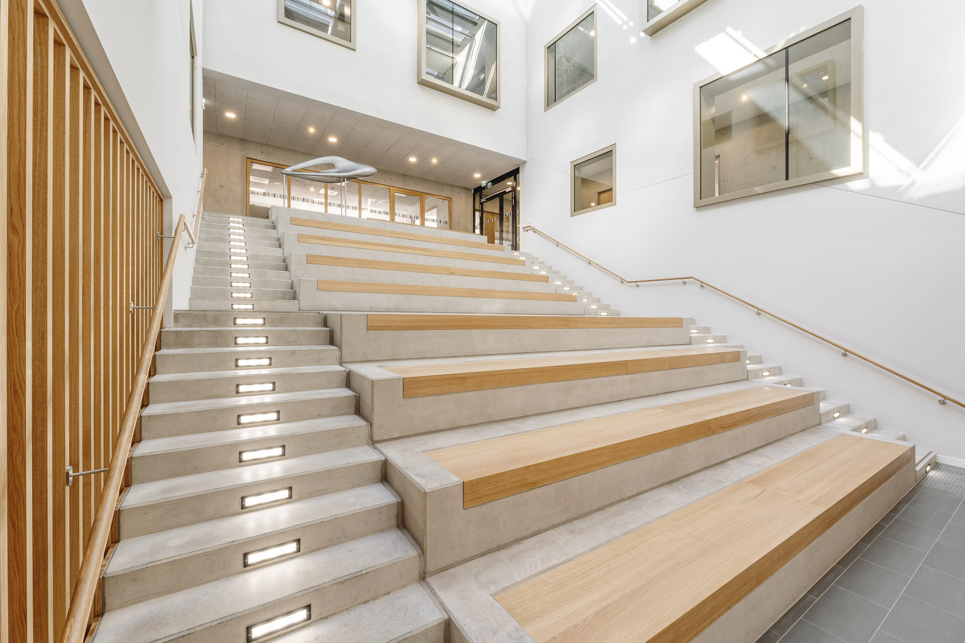 Der Rundgang begann im Bereich des Kiosks und führte die Besucher weiter zur Aula, zur Verwaltung und ermöglichte auch Einblicke ins Pädagogen Café und Lehrerzimmer. Die Besichtigung umfasste auch die Bibliothek für Kunst und den Werkbereich sowie den naturwissenschaftlichen Bereich. Während des Rundgangs durch den nördlichen Baukörper konnten die Besucher die Aula auf den verschiedenen Ebenen durch die großzügigen Fenster in der Hallenwand bewundern.