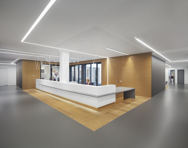 Ein besonderer Blickfang ist der großzügige Empfangsbereich, der sich mit Blickbezug zum Innenhof präsentiert, Ausgangspunkt des Lichtkonzeptes ist und mit einer Leuchte ausgestattet wurde, die die Form der Strahlung zitiert.