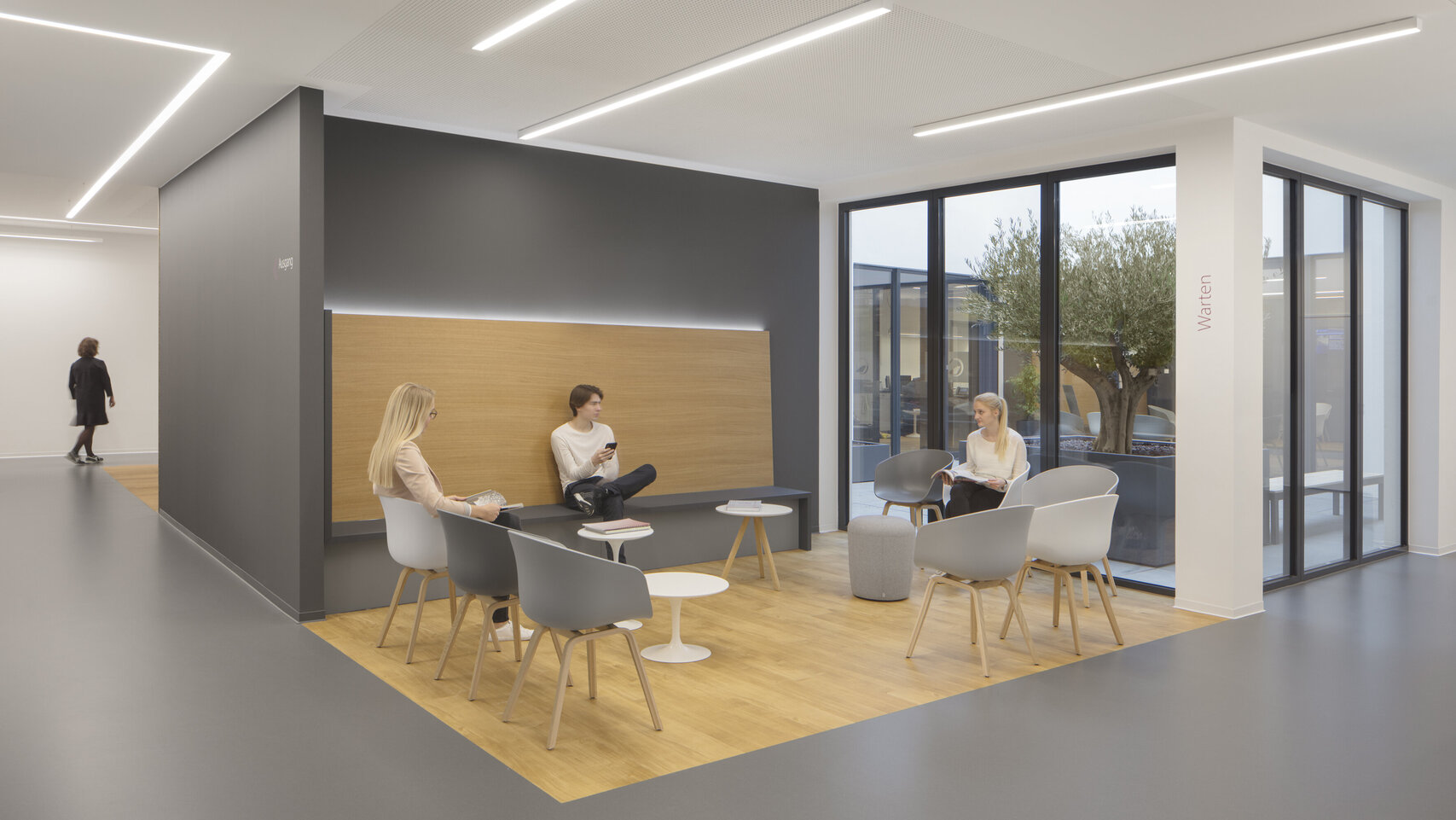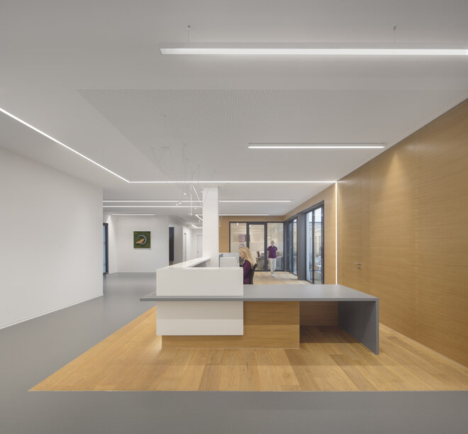 Das klare innenarchitektonische Konzept unterstützt den Workflow und erleichtert die Orientierung in der Praxis. Wenige, hochwertige Materialien wie Eiche in Echtholz, Corian und Glas verleihen der Ausstattung einen gehobenen Charakter und ergeben ein harmonisches Gesamtbild. Eine klare, reduzierte Farbwelt und ein Lichtleitkonzept unterstützen die Struktur der Praxis und runden das Gesamtkonzept ab. Das neue Logo und die grafische Darstellung des Leitsystems wurden ebenfalls von a|sh entworfen und fügen sich in das Gesamtbild ein.