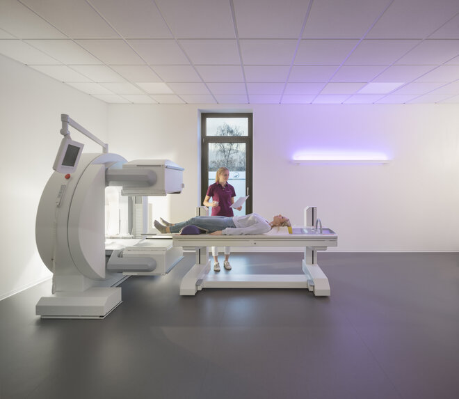 Um diesen zentralen Bereich entwickelt sich ein optimaler Workflow mit modernster Technik der radiologischen Diagnostik: mit zwei Kernspintomographen (MRT), einem Computertomographen, Röntgengerät, Mammographie, Sonographie und eine für sich abgeschlossene Abteilung der Nuklearmedizin mit zwei Gammacameras bietet die Radiologie - Neustadt an der Weinstraße das gesamte Spektrum moderner Bildgebung der diagnostischen Radiologie und Nuklearmedizin, sowie darüber hinaus die Therapie entzündlicher Gelenk- und Sehnenerkrankungen mittels nuklearmedizinischer und strahlentherapeutischer Methoden an - eine medizinische Praxis auf höchstem Niveau.