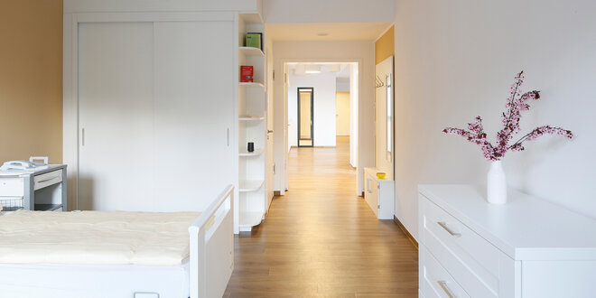 Ein Bewohnerzimmer besteht aus einem Vorbereich, von dem das Bad erschlossen wird, und einem Schlaf- und Aufenthaltsbereich. Die Bewohnerzimmer sind als Einzelzimmer konzipiert. In der Mittelzone sind die Nebenräume wie etwa Lagerräume, Pflegebad, behindertengerechtes WC oder ein Stützpunkt mit angegliederter Lagerfläche angeordnet.