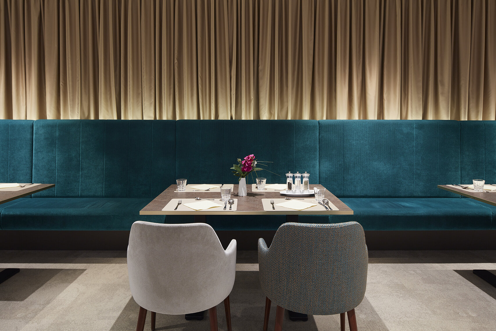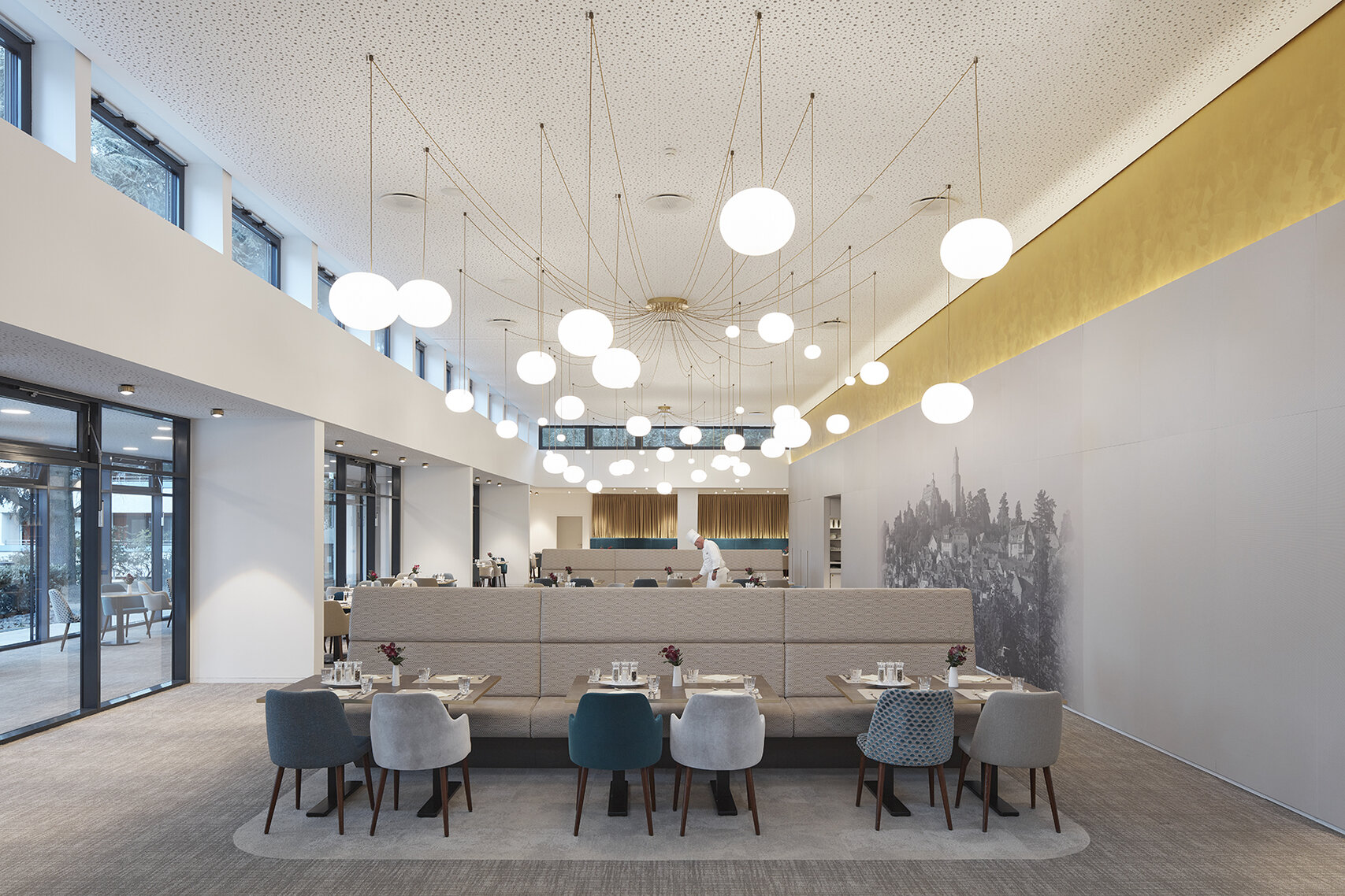 Der große Raum mit 240 Sitzplätzen erzeugt durch die harmonische Farbstimmung mit bewusst gesetzten Details in Petrol und Gold sowie der eindrucksvollen Deckenbeleuchtung eine würdevoll anmutende Atmosphäre. Die Beleuchtung setzt sich aus unterschiedlich großen Kugelleuchten zusammen und erzeugt den Eindruck eines imposanten Kronleuchters. Dieser spannt sich von der Mitte des Saals nahezu über die gesamte Decke und unterstreicht das Möblierungskonzept, das ebenfalls die Mitte des langen Saals als Zentrum definiert. Ausgehend von diesem Zentrum bieten sich zu beiden Seiten Sitzbereiche unterschiedlicher Aufenthaltsqualität: Räumlich exponierte Tischgruppen befinden sich mittig im Raum, während die beiden kurzen Seiten des Raumes zurückgezogene Zonen mit geschützteren Bereichen darstellen, unter anderem erzeugt durch indirekte Beleuchtung und abgehängte Decken.