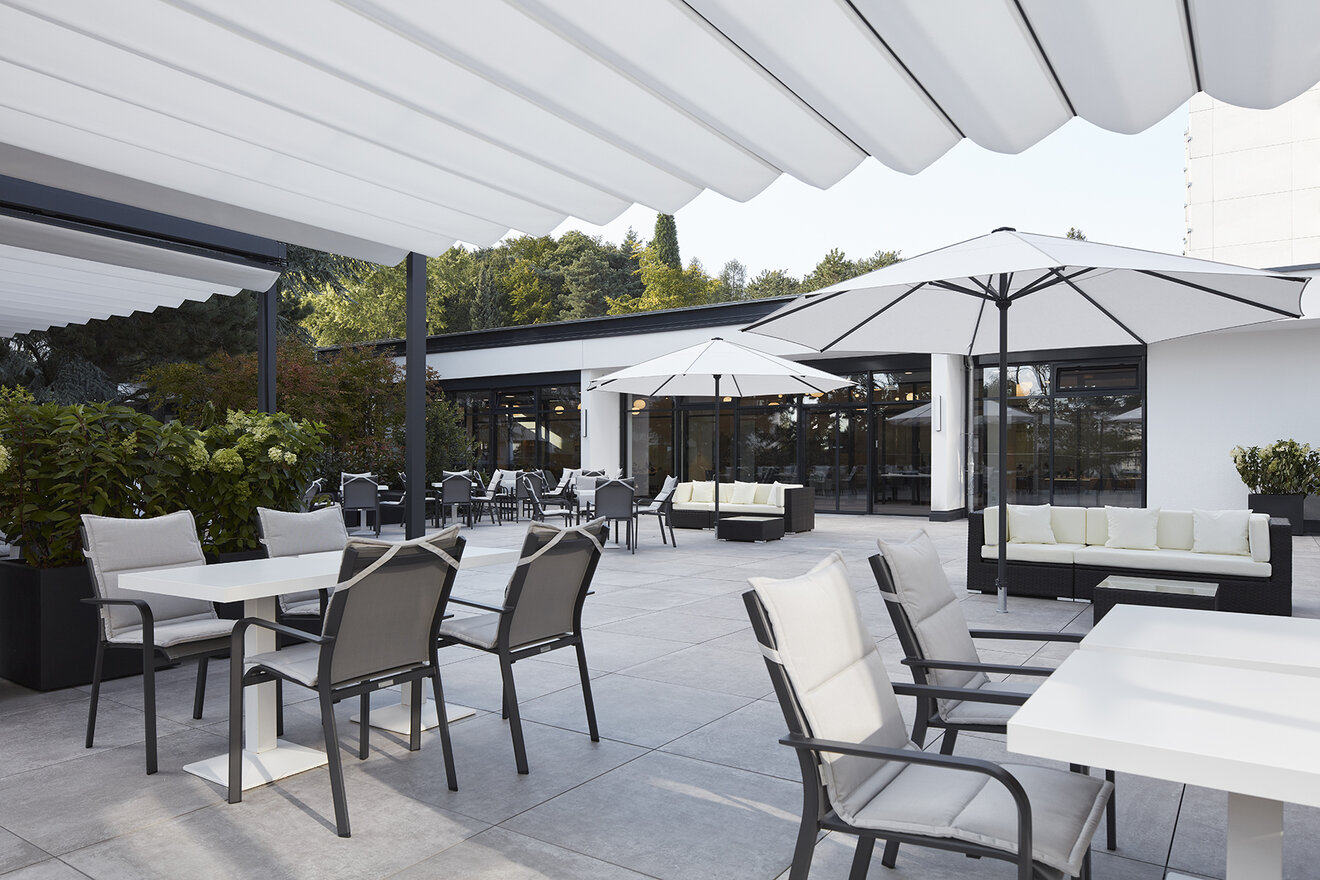 Das gesamte Möblierungskonzept ist klar und strukturiert, bietet dennoch Varianz durch größere und kleinere Sitzgruppen, vereinzelt farbig abgesetzte Polsterung und Material- und Farbdetails. Sitzbänke mit erhöhter Rückenlehne gliedern die einzelnen Zonen im Raum und ein Wechsel im Bodenbelag grenzt auf dezente Weise die Laufzonen von den Essbereichen ab. Eine gute Akustik wird erreicht, indem ein hoher Anteil schallabsorbierender Materialien eingesetzt ist, beispielsweise Sitzpolster und Teppichboden, aber auch durch Akustikpaneele an der Decke und eine perforierte Wandverkleidung mit dem Motiv der Burg Kronberg. Indem man das Stadtpanorama mit der Burg Kronberg als monochrome Wandgrafik in Grautönen mittig auf der langen Wandseite platziert, schafft man auf ansprechende Weise den Bezug zur Stadt, stärkt die Identität der dort Wohnenden und betont gleichzeitig das Raumzentrum.