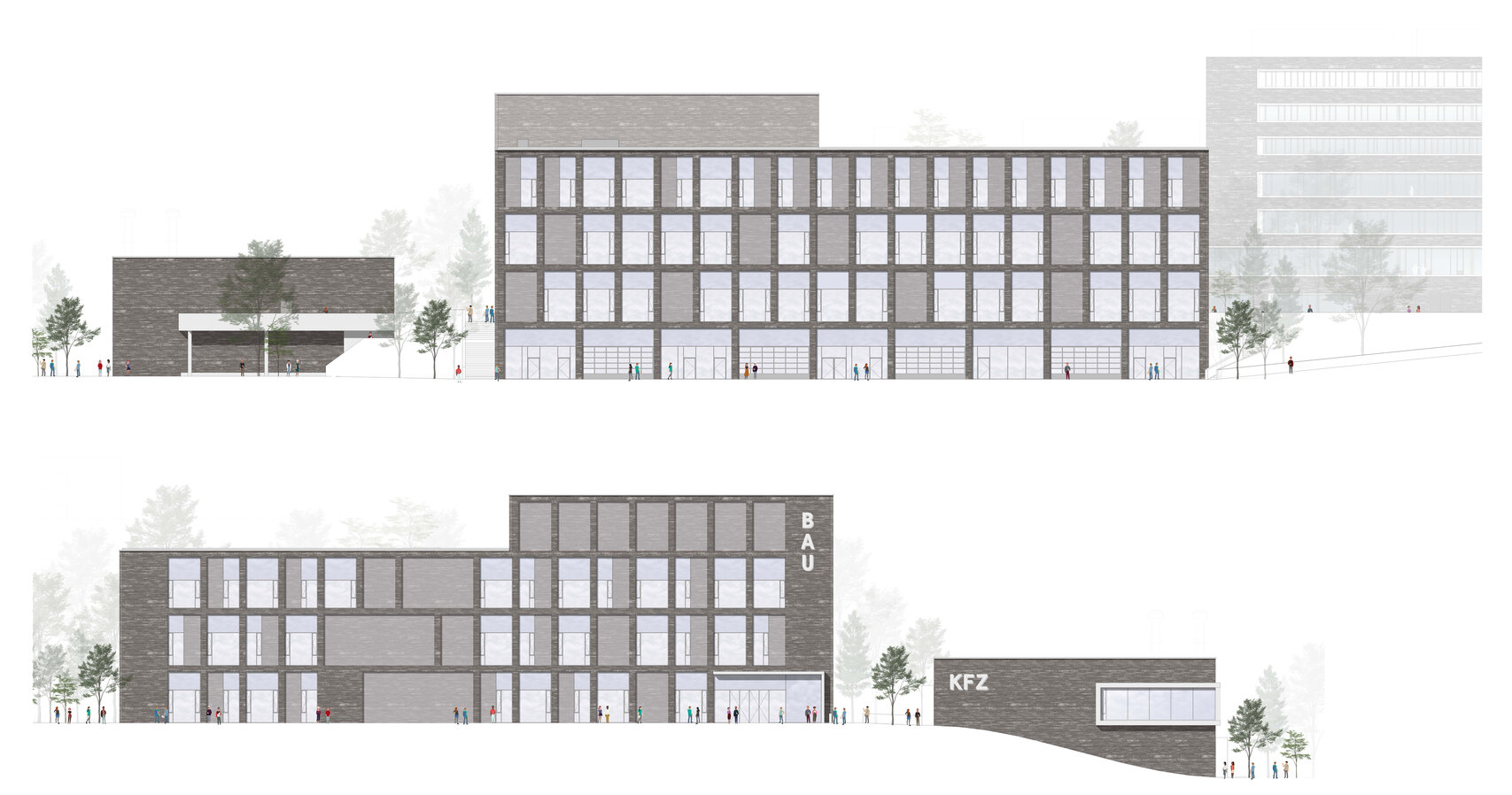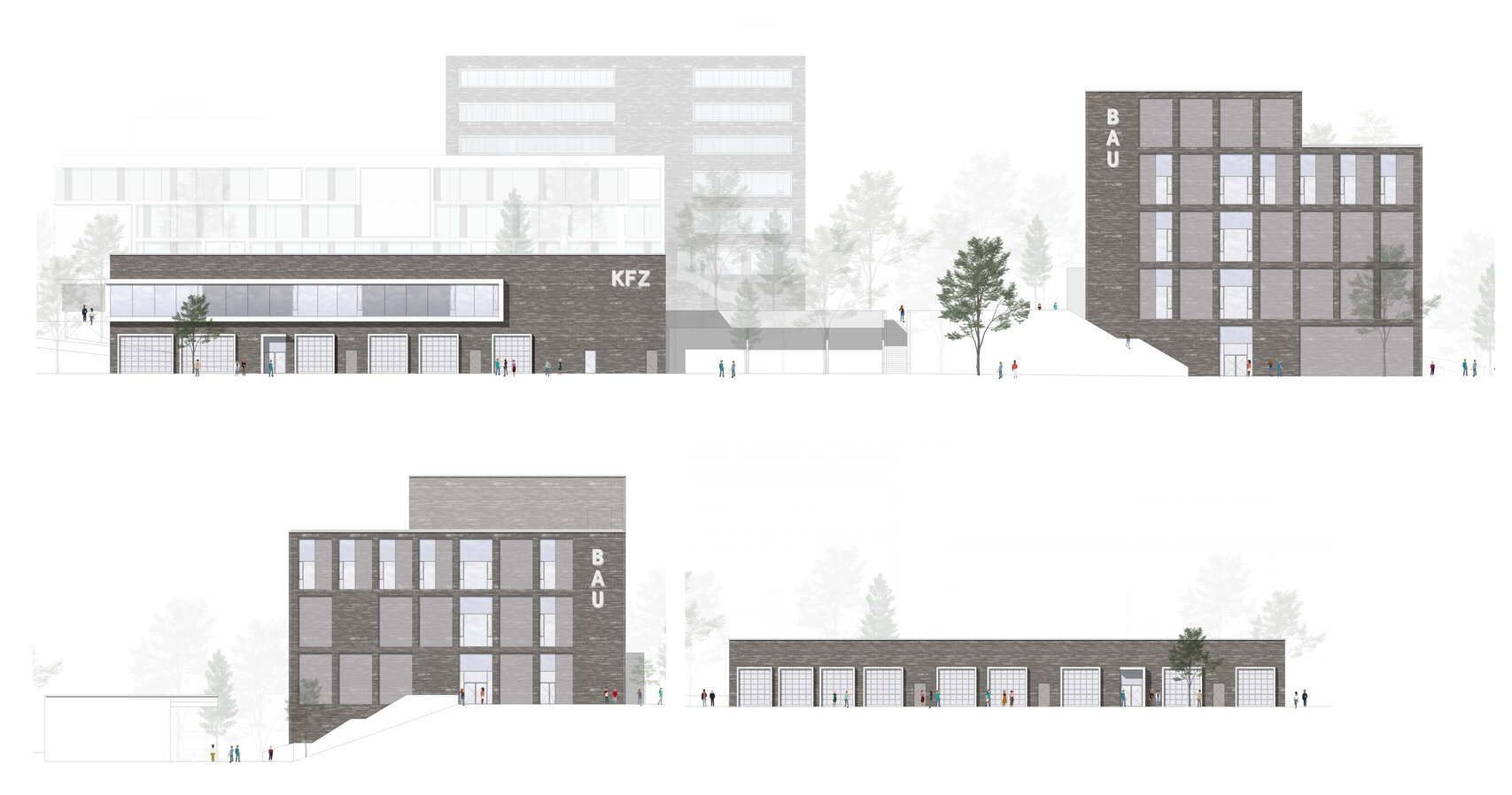 Die benötigten Flächen werden auf zwei Gebäude aufgeteilt: ein größeres, in der Höhe gestaffeltes 5-geschossiges Gebäude „Bau“ mit Bauhallen, Theorieräumen und der Verwaltung sowie ein 2-geschossiges Gebäude „KFZ“ mit Räumen für den Bereich KFZ und Fahrzeuglack. Der Bereich für die Bau-Ausbildungsberufe erstreckt sich über drei Ebenen. Alle Hallen werden direkt von außen befahrbar sein.