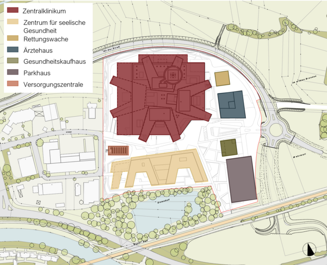 Auf drei klar definierten Baufeldern werden die medizinische Versorgung, die seelische Gesundheit sowie ergänzende Angebote vereint – und durch einen gemeinschaftlichen Garten verbunden: das Zentralklinikum (Dreiland-Klinikum), das Zentrum für seelische Gesundheit, eine Rettungswache sowie ein Ärzte- und Gesundheitskaufhaus mit angeschlossenem Parkhaus.