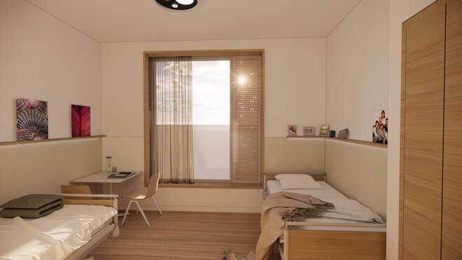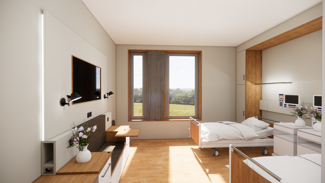 In beiden Einrichtungen – dem Zentralklinikum und dem Zentrum für seelische Gesundheit – orientieren sich die Patientenzimmer zur Landschaft und eröffnen einen Ausblick ins Grüne, der das Wohlbefinden steigert und den Heilungsverlauf positiv beeinflusst.