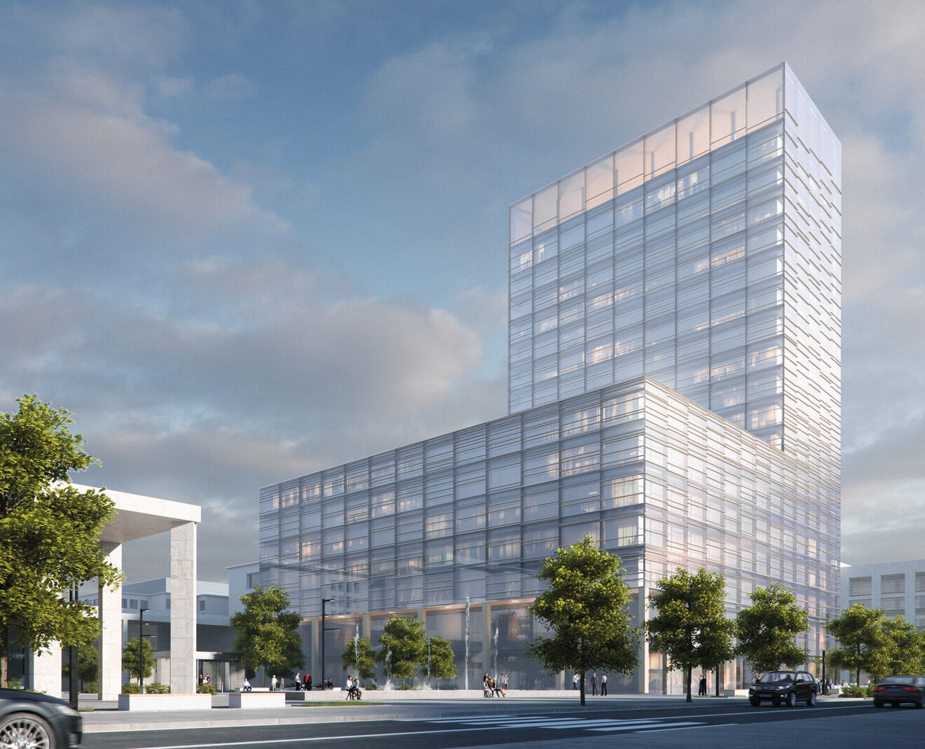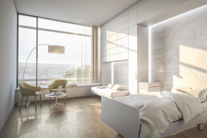 Mit der Erweiterung des Kranken­hauses am Standort Kirchberg plant die Fondation Hôpitaux Robert Schuman (HRS) den Neubau eines innovativen und zukunfts­orientierten Ambulanz- und Pflegezentrums. a|sh architekten entwarfen zusammen mit dem Atelier d'architecture et de design Jim Clemes SA ein Gebäudeensemble, welches das städtebauliche Höhenthema als Sockelzone interpretiert, auf dem ein Patientenhotel als Hochpunkt aufsitzt.