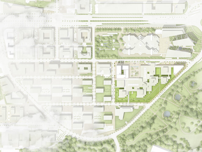 Die Erweiterung des Centre Hospitalier nimmt dieses städtebauliche Höhenthema auf und interpretiert es als Sockelzone für einen städtebaulichen Hochpunkt, das zukünftige Patientenhotel. Diese Sockelzone wird an der West- und Ostseite des Klinikgrundstücks überhöht und bildet den städtebaulichen Rahmen für das Ensemble des neuen CHK. Der bestehende Eingangshof wird zusammen mit dem Erweiterungs­bau neugestaltet. Die Verlegung der Zufahrten zur Parkgarage eröffnet eine neue stadträumliche Verbindungsachse und schafft einen Fußweg in das südwestlich angrenzende Wohnquartier.