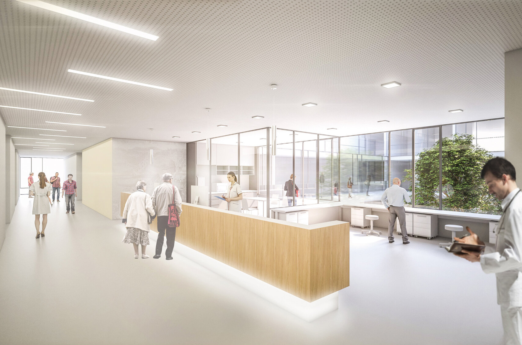 Das neue CHK empfängt den Besucher und Patienten über einen großzügigen Eingangshof mit umlaufenden Kolonnaden. In allen Gebäuden, den Freiräumen und Zuwegungen wird Barriere­frei­heit geschaffen und für die Patienten, das Personal und die Besucher eine intuitive Orientierung. Die Wegeführungen für stationär liegende Patienten, ambulante Patienten, Besucher, Personal und Güter sind entkoppelt und somit kreuzungsfrei. Der Hotelturm positioniert sich an der westlichen Grundstücksecke. An den neuen Kolonnaden liegt das Foyer des Centre Hospitalier und bildet eine Verbindung zwischen dem Innenhof und der Rue Dr. Nicolas Clasen. Die Kolonnaden verbinden Alt und Neu. Am Foyer des CHK befinden sich die Notfallpraxen. Diese sind von der Straße aus erschlossen. Die Ambulanzen der Ophtalmologie, Nephrologie/Dialyse, die Tagesklinik und die Stationäre Pflege Geriatrie legen sich um den Innenhof und orientieren sich mit den Pflegezimmern nach außen. Zum Innenhof und den beiden flankierenden Straßen „Clausen“ und „Steichen“ liegen Laden- und Gewerbeflächen.