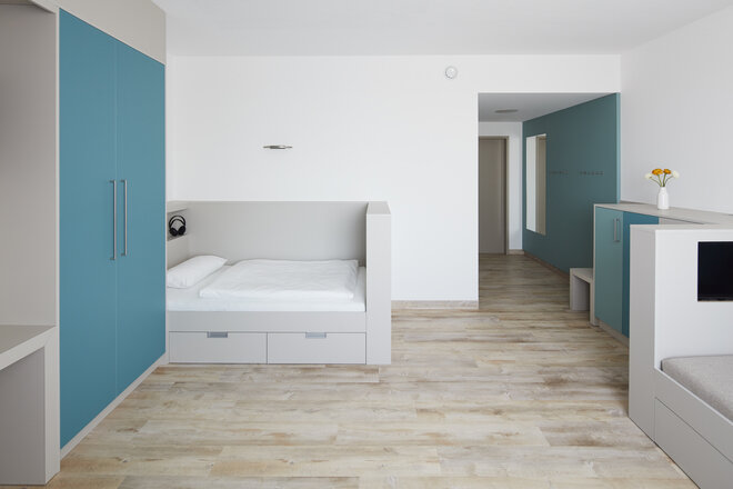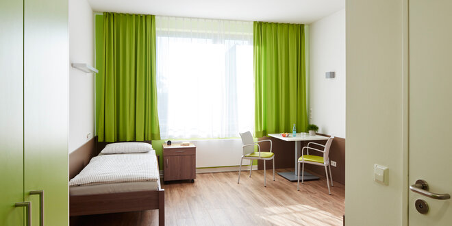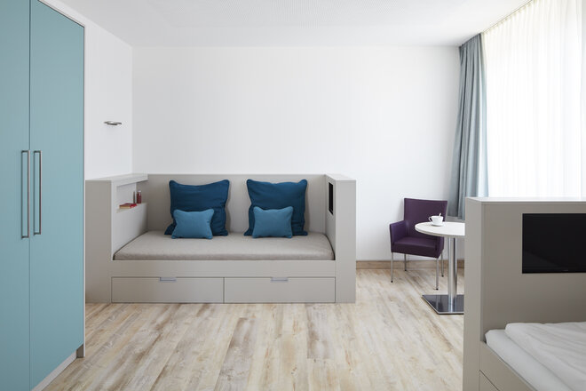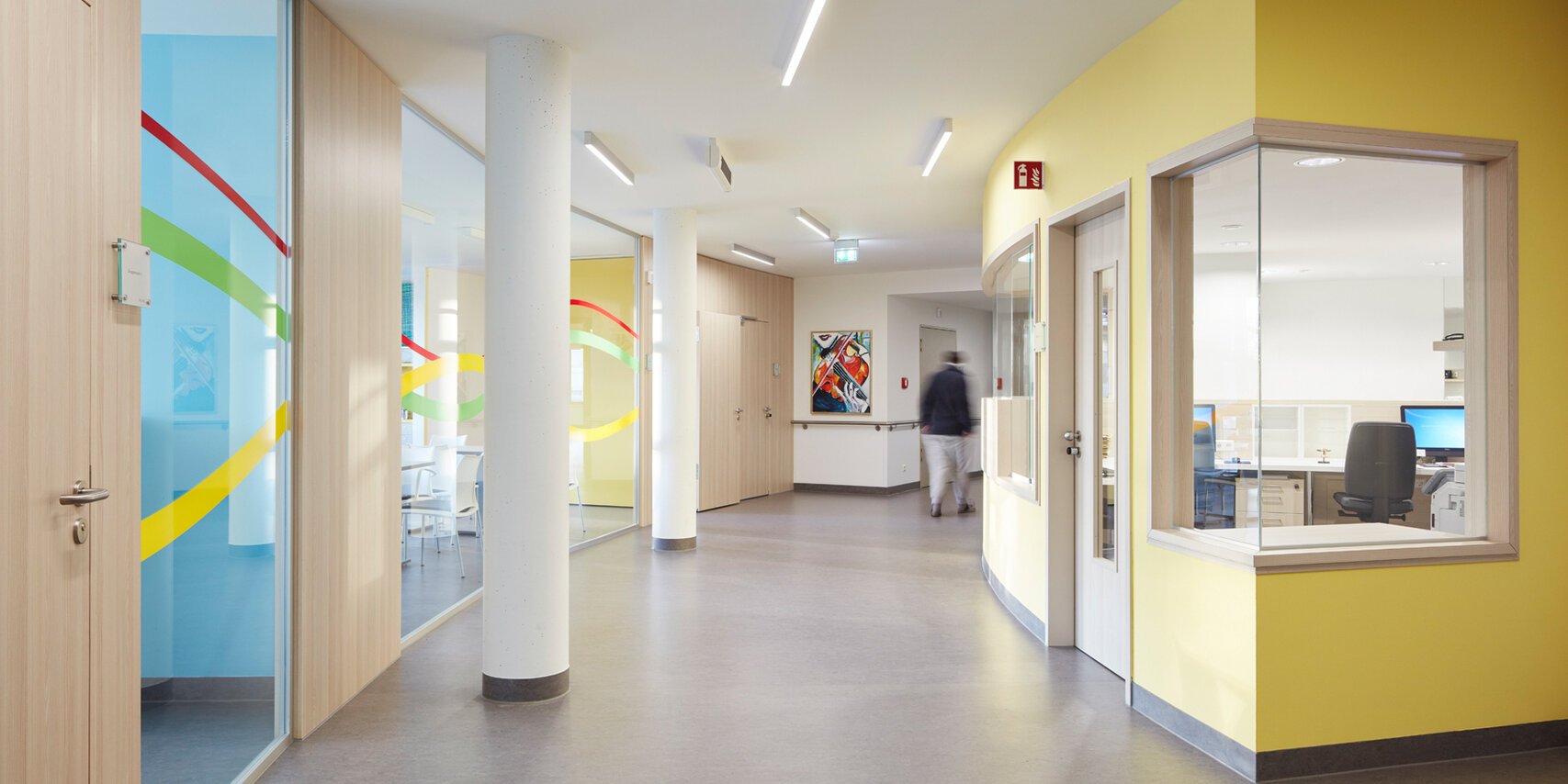 Zur Unterstützung der Orientierung im Inneren des Gebäudes wurden die verschiedenen Funktionsbereiche farblich gegliedert, so setzen sich etwa die blau gekennzeichneten Therapieflächen von den gelb gestalteten Aufenthaltsbereichen und grün gehaltenen Patientenzimmern ab. Die Wahlleistungsstation erhält eine besondere Ausstattung sowie Farb- und Materialgebung.