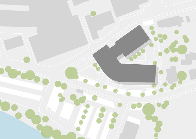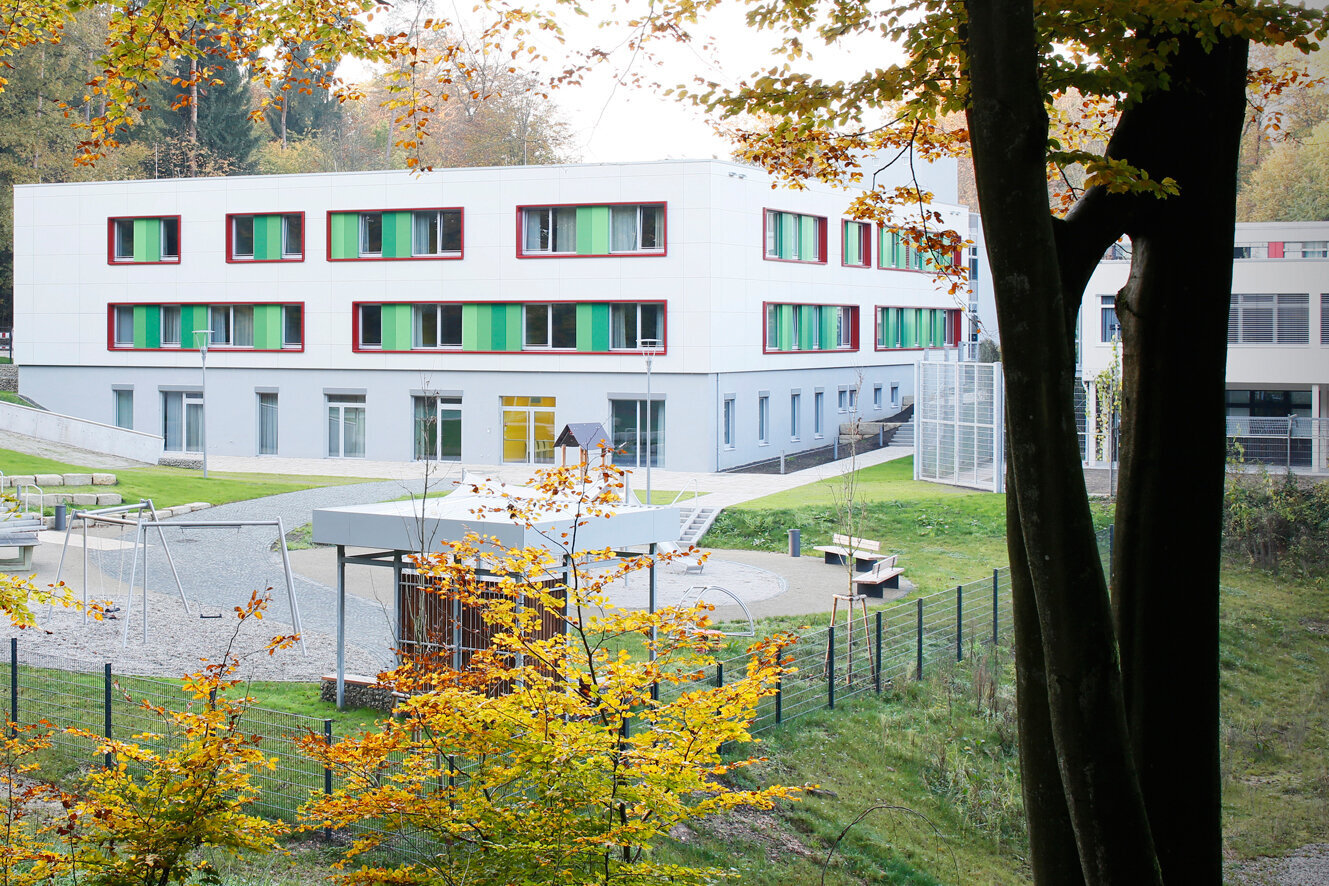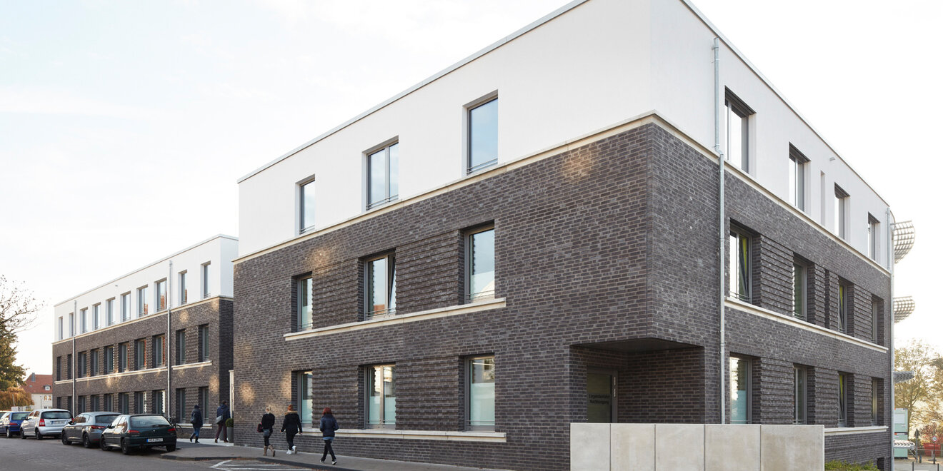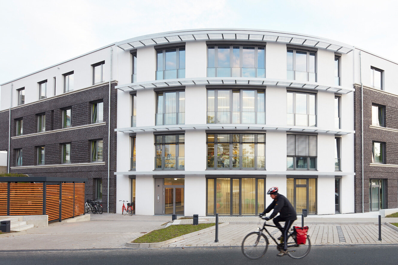 Der Neubau passt sich in seiner zurückhaltenden Gestaltung seiner Umgebung an. Durch die abgerundete Form und die vorgelagerten Grünzonen tritt der Bau von der südlichen Straßenkante zurück und bildet einen attraktiven Vorplatz. Gleichzeitig nimmt er die Höhen der Nachbargebäude auf. Die Hauptfassaden wurden bis zur Ebene 1 verklinkert, die Klinkerfassade stellt einen Bezug zur Materialität der Region und zum historischen Pflegewohnheim gegenüber her. Das oberste Geschoss und Teile des abgerundeten Gebäudeteils heben sich mit einer hellen Wärmedämmputzfassade von der restlichen Fassade ab und lockern diese auf.