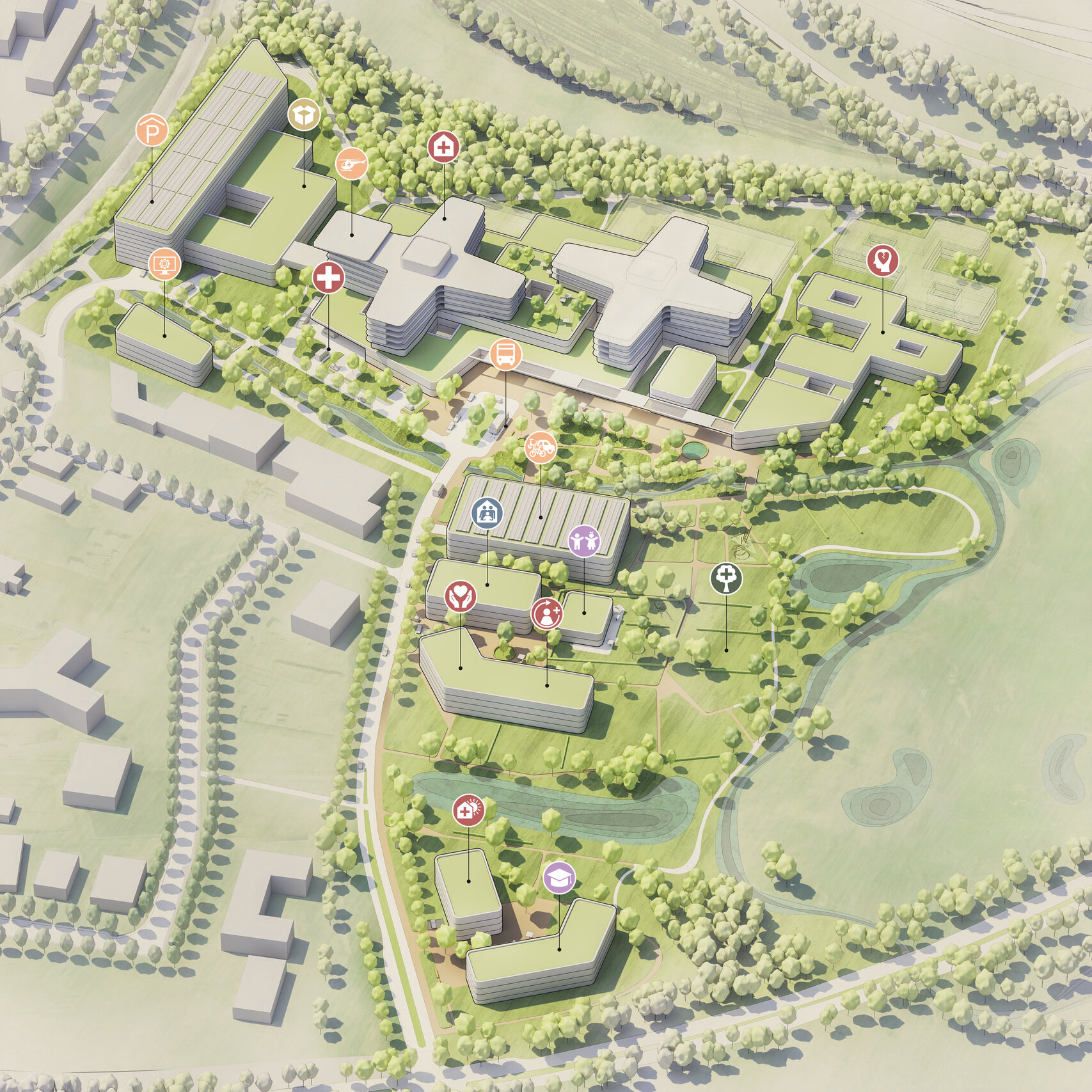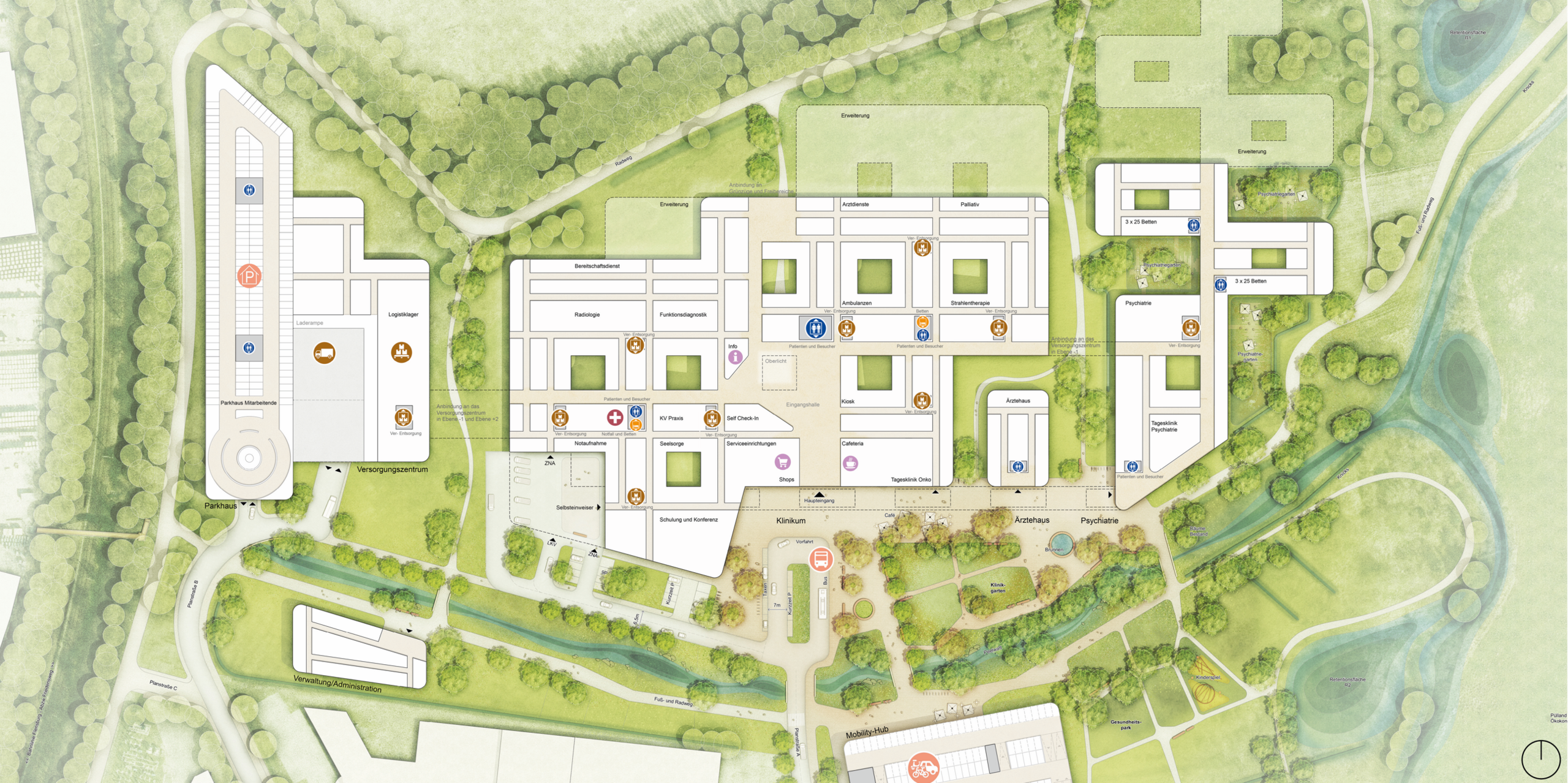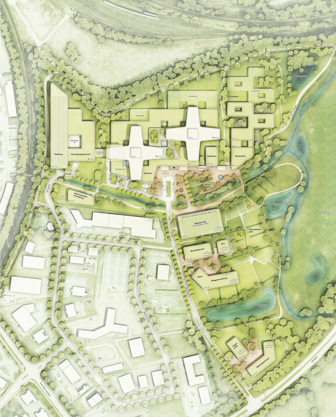 Darüber hinaus sieht der Entwurf zahlreiche zusätzliche Einrichtungen vor, die das Campuskonzept ganzheitlich abrunden: ein Ärztehaus, eine psychiatrische Tagesklinik, eine stationäre Psychiatrie, ein Boardinghaus, eine Kindertagesstätte, eine Rehabilitations- und Pflegeeinrichtung, ein Versorgungszentrum sowie Verwaltungs- und Bürogebäude. Für Mitarbeiter:innen wird zudem ein separates Parkhaus geschaffen, das zur Entlastung des Gesamtverkehrs beiträgt.