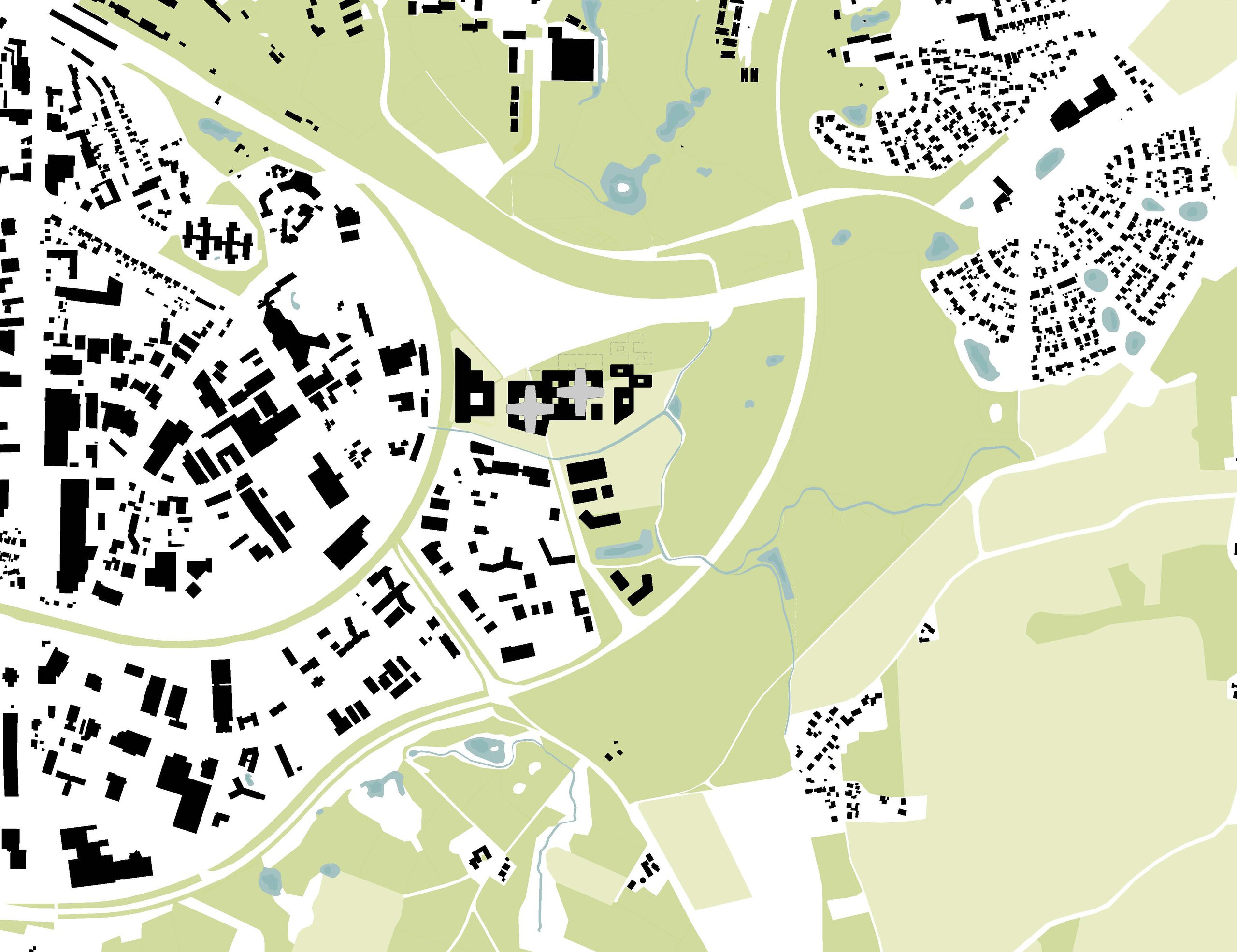 Kennzeichnend für den Entwurf sind die funktionale Hierarchie der Nutzungen und die optimale Erschließung des Campusareals. Die städtebauliche Struktur fördert kurze Wege zwischen den medizinischen, pflegerischen und sozialen Einrichtungen – und unterstützt so ein vernetztes, menschzentriertes Versorgungskonzept, das auf interdisziplinäre Zusammenarbeit und patient:innennahe Abläufe ausgerichtet ist.