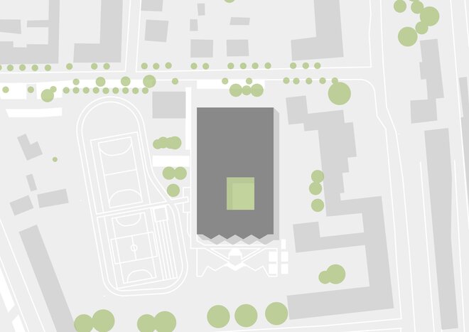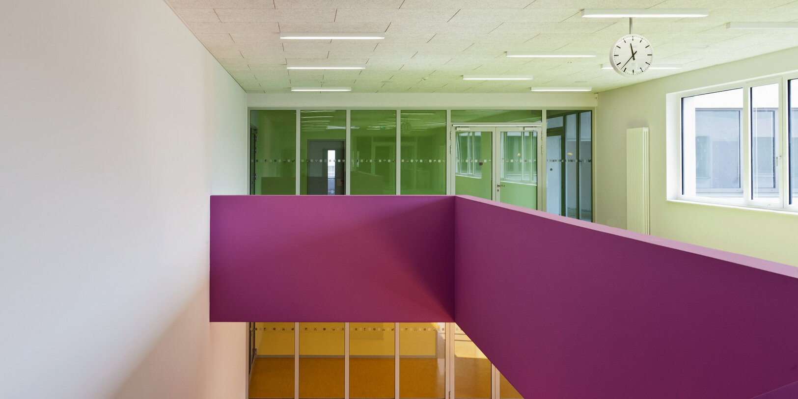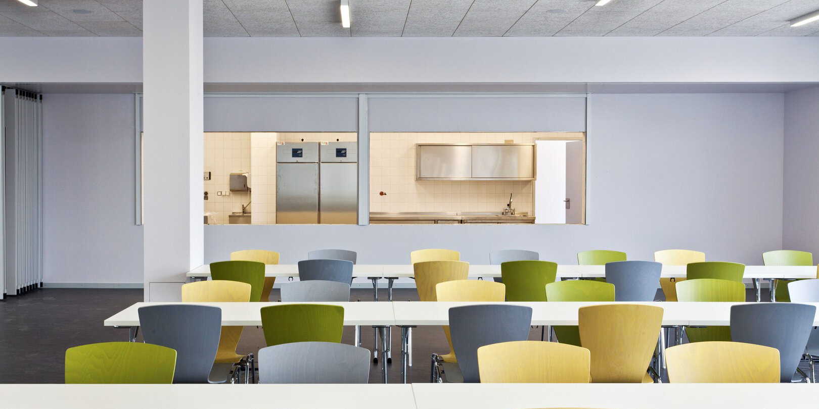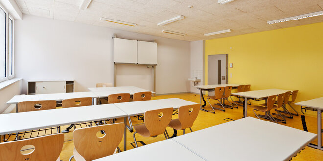 Der Ansatz ist die Flexibilität der allgemeinen Unterrichtsräume. Gebaute Beispiel aus der Reformpädagogik wurden referentiell betrachtet und bewertet. Die Sekundarstufe I erhielt 14 Klassenräume, die Sekundarstufe II neun Kursräume. Um dem Wunsch der Schule nach Räumen für zukunftsweisende und flexible Unterrichtsmodelle zu entsprechen, wurden in enger Zusammenarbeit mit der Schulleitung innovative Unterrichtsräume mit sechseckigem Grundriss und flexibler Möblierung entwickelt.