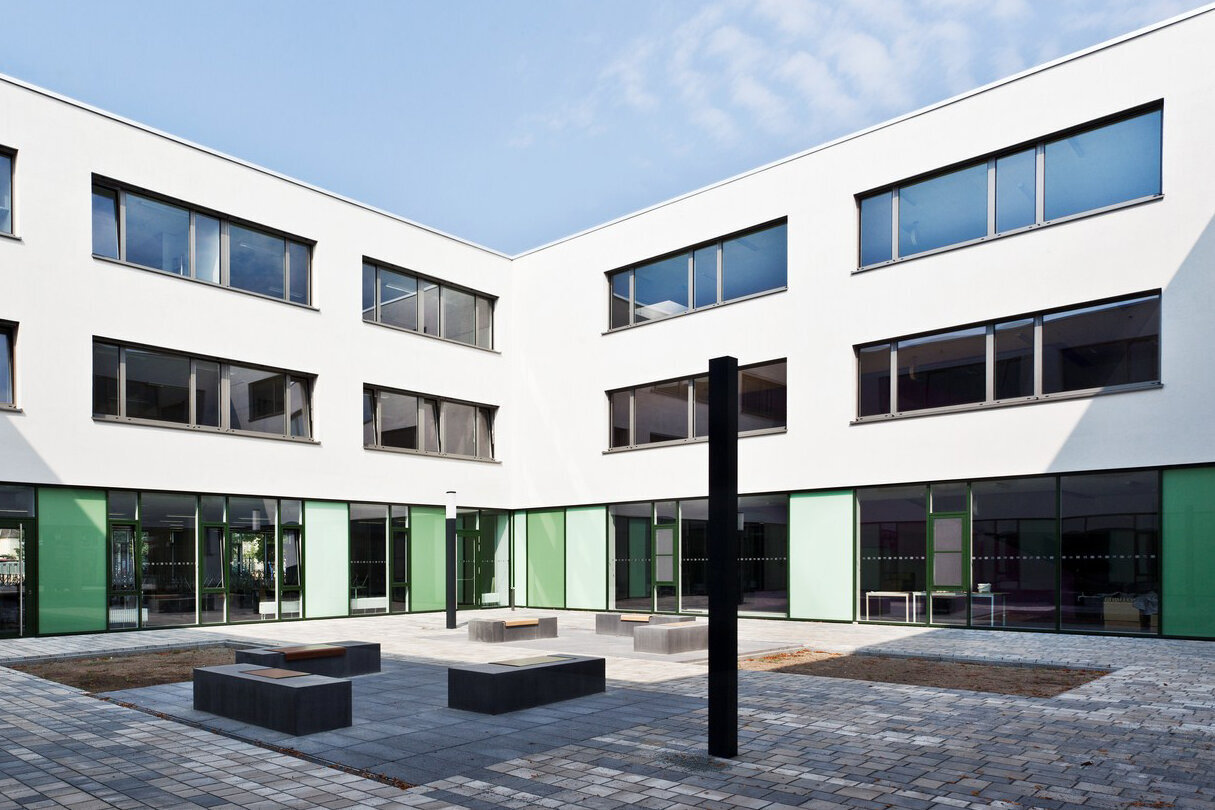 Die aus der sechseckigen Grundrissform der allgemeinen Unterrichtsräume resultierenden flurseitigen Nischen wurden als frei möblierbare Gruppenarbeitsplätze ausformuliert und stellen somit auch alternative Lernräume dar. Die großzügigen Verglasungen zu den Klassenräumen bringen viel Tageslicht in diese Bereiche. Des Weiteren wurden acht Fachunterrichtsräume und 288 Fahrradstellplätze eingerichtet. Der Altbau wird seit seiner Sanierung als Volkshochschule genutzt.