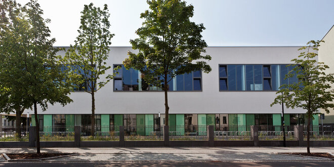 Der Neubau befindet sich im Sanierungsgebiet der Stadt Oranienburg. Der Baukörper wurde über eine städtebauliche Variantenuntersuchung behutsam in das historische Umfeld eingefügt. Er ist von der Straße zurück in das Blockinnere versetzt. Der Neubau ersetzt den Altbau organisatorisch und ergänzt ihn architektonisch, indem er den Schulhof baulich fasst und erweitert. Die neue Architektur verhält sich zurückhaltend gegenüber dem Bestandsbau. Die Fensterbänder greifen städtebauliche Elemente der Nachbarschaft auf. Die Fassade zum Hof erscheint als Zickzack-Faltung, die aus der inneren Konzeption der Klassenräume entstand.