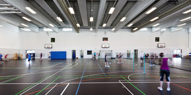 Aufgrund der räumlicher Enge auf dem Grundstück wurde die Sporthalle im ersten Obergeschoß des Bildungszentrum Runge mit besonderen statischen und schallschutztechnischen Anforderungen vorgesehen. Die Umkleiden, Sanitärräume und Technik, der auch extern genutzten Sporthalle, befinden sich im Erdgeschoß. Die Sporthalle wurde im Konjunkturprogramm gefördert und musste als 1. Bauabschnitt im Jahr 2011 fertiggestellt werden.