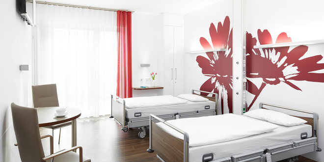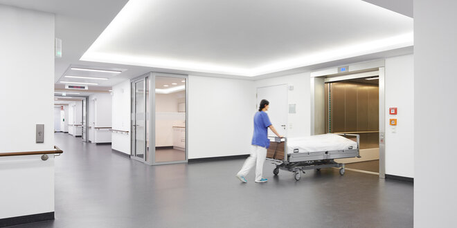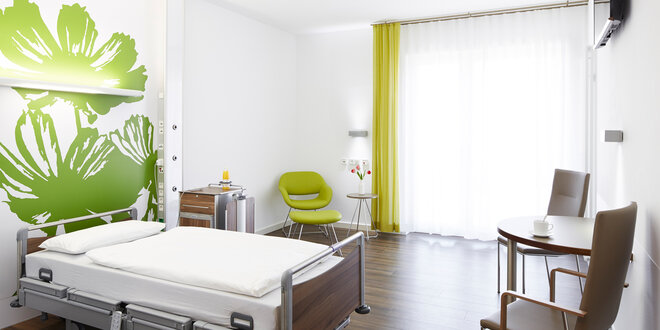Zwei der Stationen wurden als Wahlleistungsbereiche mit einem größeren Anteil an Einbettzimmern umgesetzt. Diese verfügen über hochwertige Böden in Holzoptik, die Nasszellen wurden mit hellen, großformatigen Fliesen und bodengleichen Duschen ausgestattet.