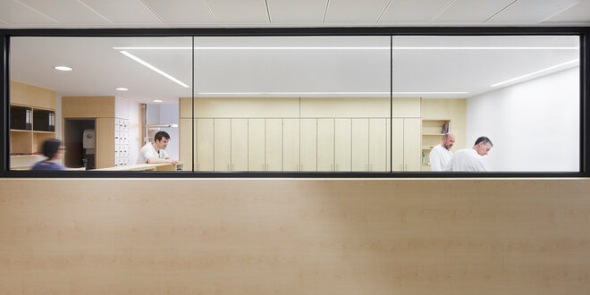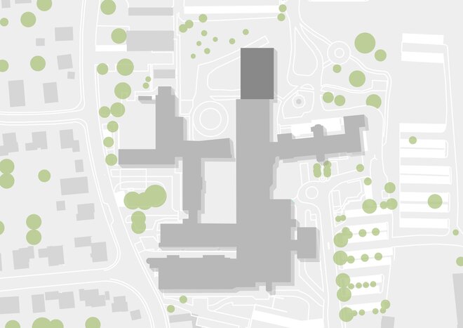 Im Erdgeschoss wurden zusätzliche Behandlungs- und Funktionsbereiche für die Innere Medizin, Kardiologie und Neurologie untergebracht. Bestehende Stützpunkte des Bestandsbaus wurden saniert und brandschutztechnisch überarbeitet. In den Ebenen 1 bis 3 entstanden moderne Pflegebereiche mit insgesamt 37 Ein- und Zweibettzimmern sowie Arztzimmern. Großzügige, bodenlange Verglasungen verleihen hier ein freundliches Ambiente.
