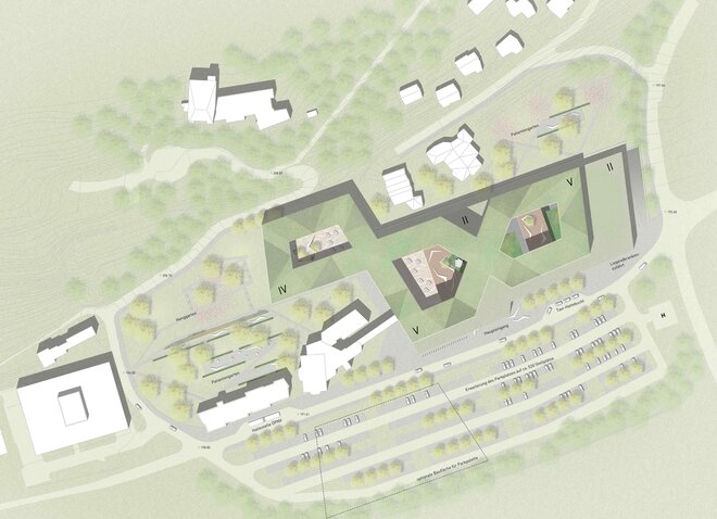 Das Gebäude erzeugt Bewegung, gibt Orientierung und schafft so einen sozialen Raum. Mit der Maßgabe „keiner schaut nach Norden“ orientieren sich die Pflegezimmer in Richtung Osten, Westen und Süden zur Landschaft. Das große Volumen wird in drei Pflegeebenen und zwei Klinikebenen über die Vertikale gegliedert und so in eine menschliche Dimension übergeführt. Die Figur der Endlosschleife erzeugt neben der Analogie zu einer Doppelacht eine prozessoptimierte innere Erschließungsstruktur mit kurzen Wegen, Umläufen und Kommunikationszonen an den Kreuzungspunkten.