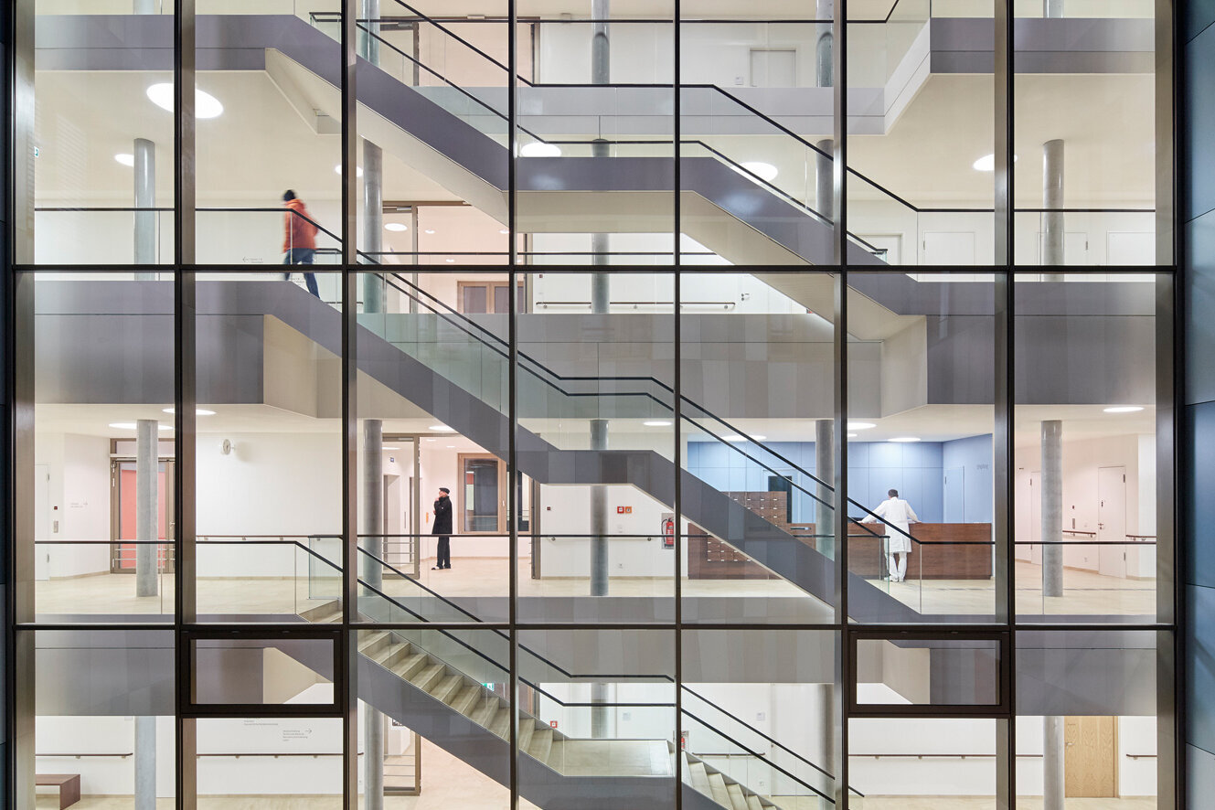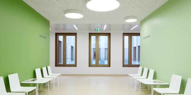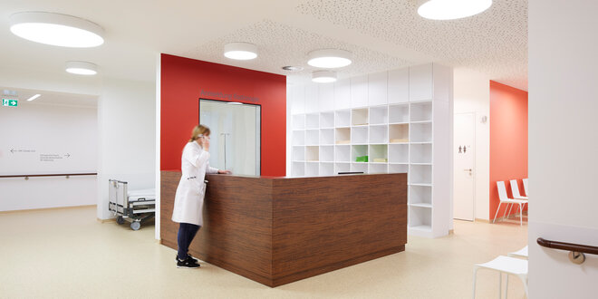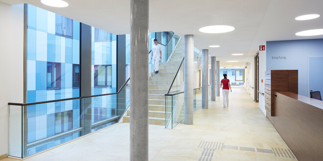 Auch Wirtschaftlichkeit, Prozessoptimierung und eine einfache Orientierung standen bei der Planung im Vordergrund. So wurde das Erdgeschoss der Glantal-Klinik als zentrale Diagnostik- und Eingriffsebene gestaltet. Zudem entschloss man sich, eine interdisziplinäre Belegabteilung zu integrieren, die wohnortnah akutstationäre Therapien aus den Disziplinen HNO, Urologie, Gynäkologie und Orthopädie anbieten wird. Niedergelassene oder im ambulanten Sektor angestellte Mediziner können sich in Filialpraxen im Haus ansiedeln und die dortige Infrastruktur nutzen.