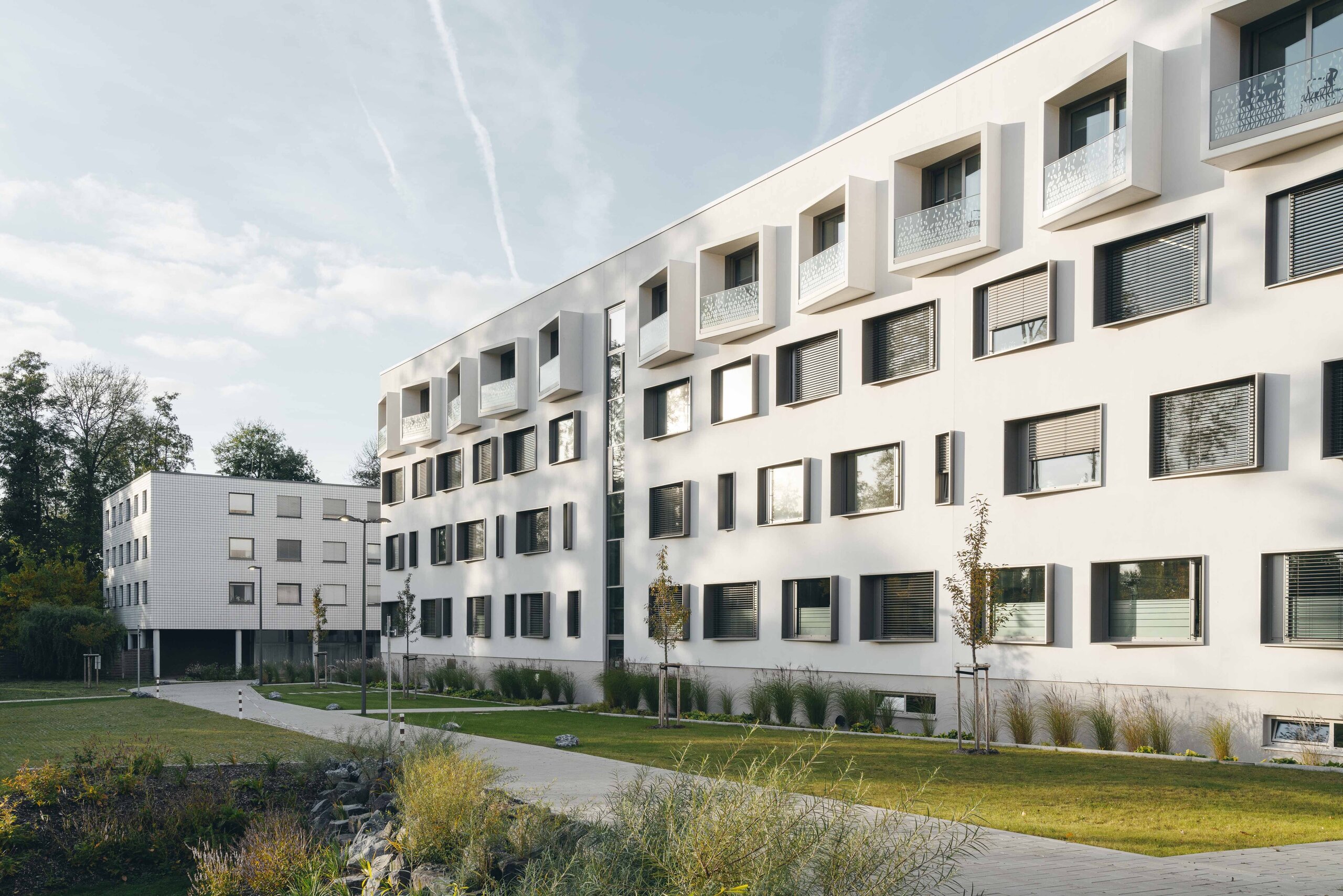 Das neue Gebäude liegt im rückwärtigen Bereich westlich der gewachsenen Klinik. Der Neubau von a|sh architekten wird als fünfgeschossiger Baukörper mit einem Untergeschoss und vier oberirdischen Geschossen in westlicher Anbindung an das bestehende Bettenhaus errichtet. Der kompakte Baukörper liegt zwischen der Kapelle im Norden, dem Schwesternwohnheim im Westen und der Parkanlage im Süden. Er beinhaltet verschiedene Funktions- und Pflegebereiche. Der Hauptzugang verbleibt im Kern des Hauptgebäudes. An diesen schließt der Neubaus in allen Geschossen an. Zwei Innenhöfe belichten und belüften den Neubau. Die durch den Neubau entstehende innere Ringstruktur ergänzt den Bestand sinnvoll und bietet große Vorteile in der funktionalen Verzahnung der medizinischen und pflegerischen Abläufe. Dadurch können auch Zimmer stationsübergreifend nach Bedarf genutzt werden. Ein sogenanntes Floaten wird ermöglicht.