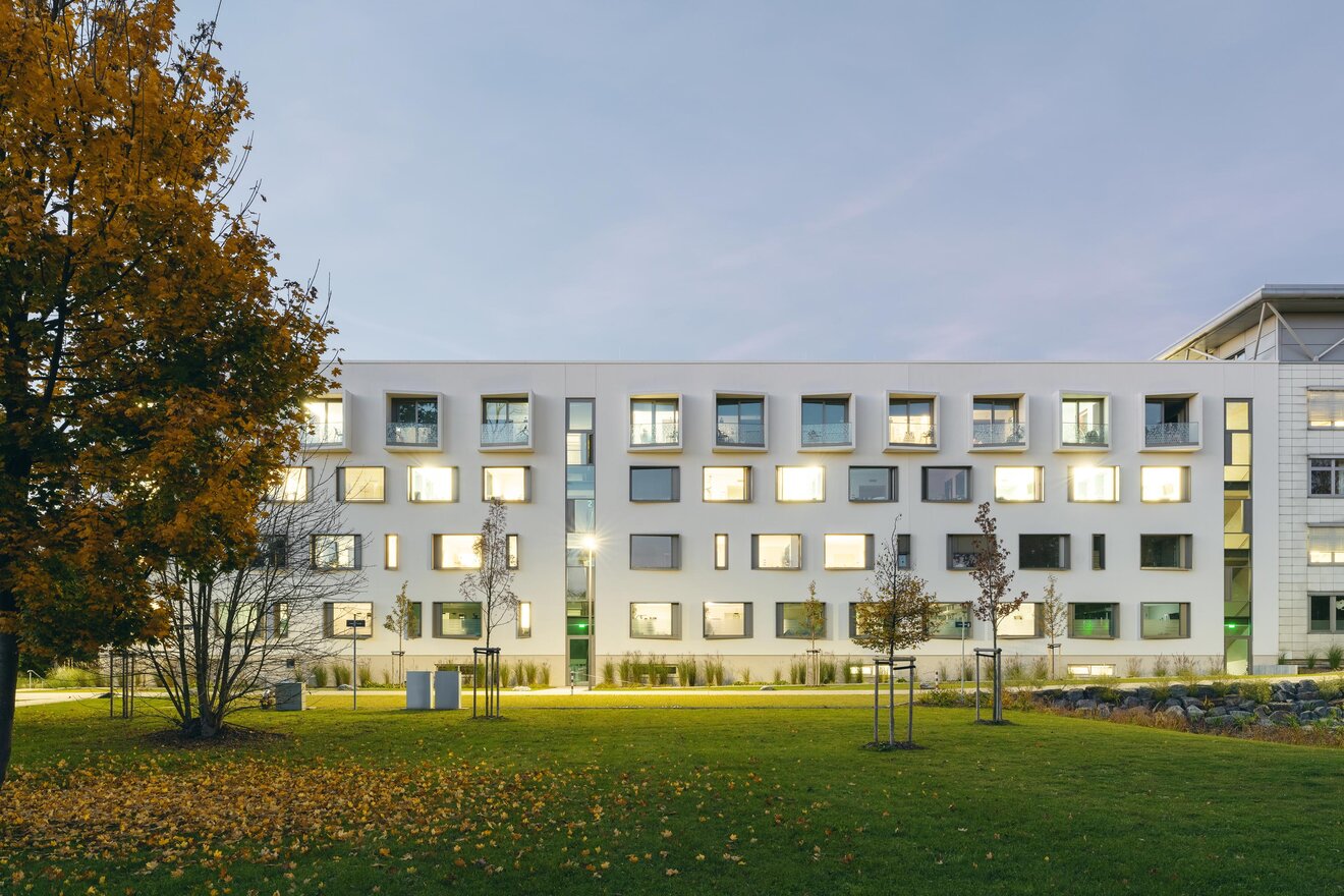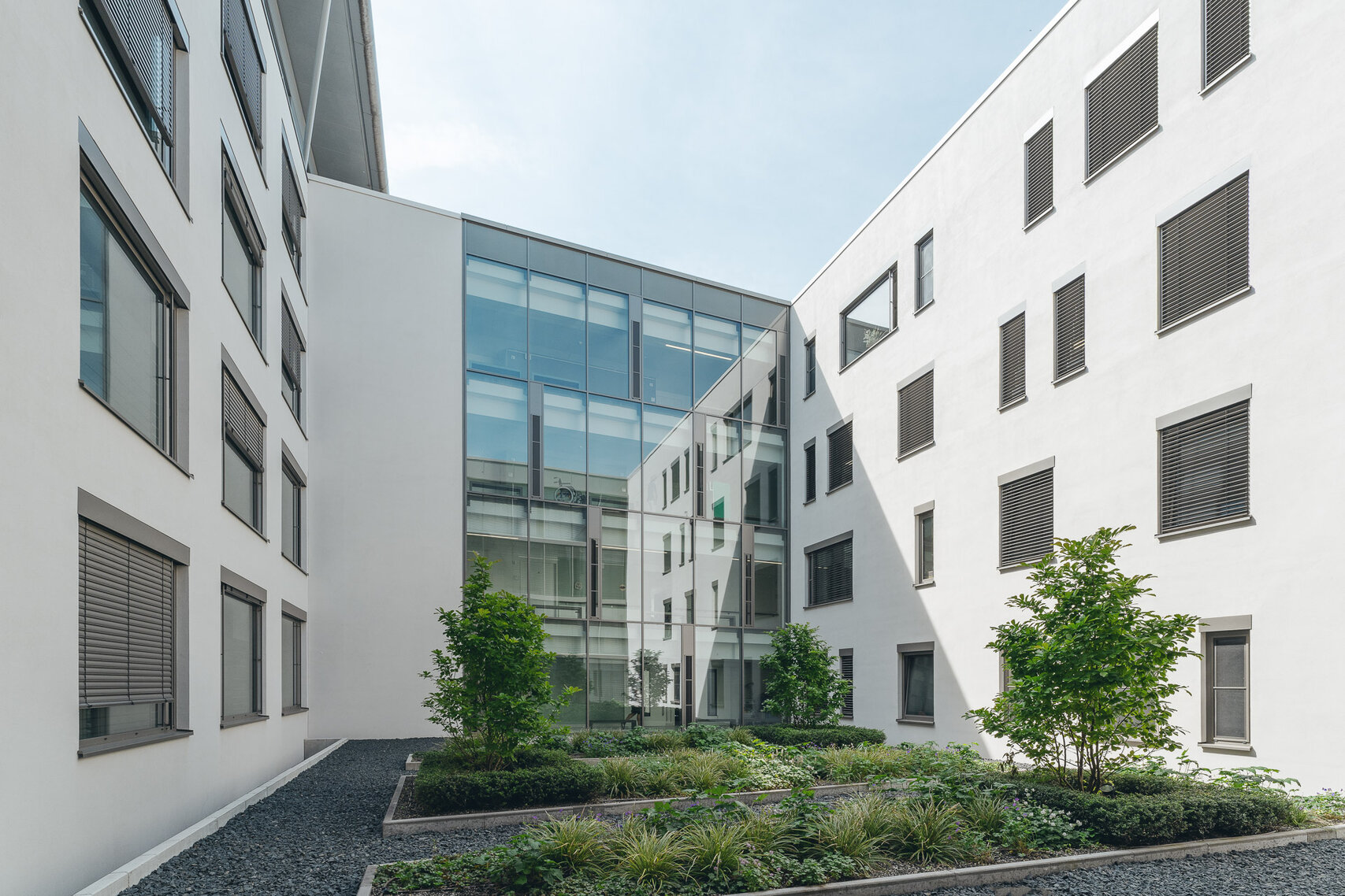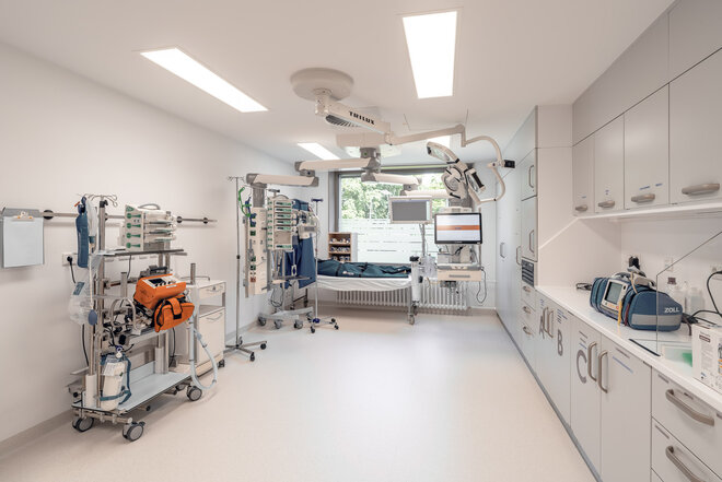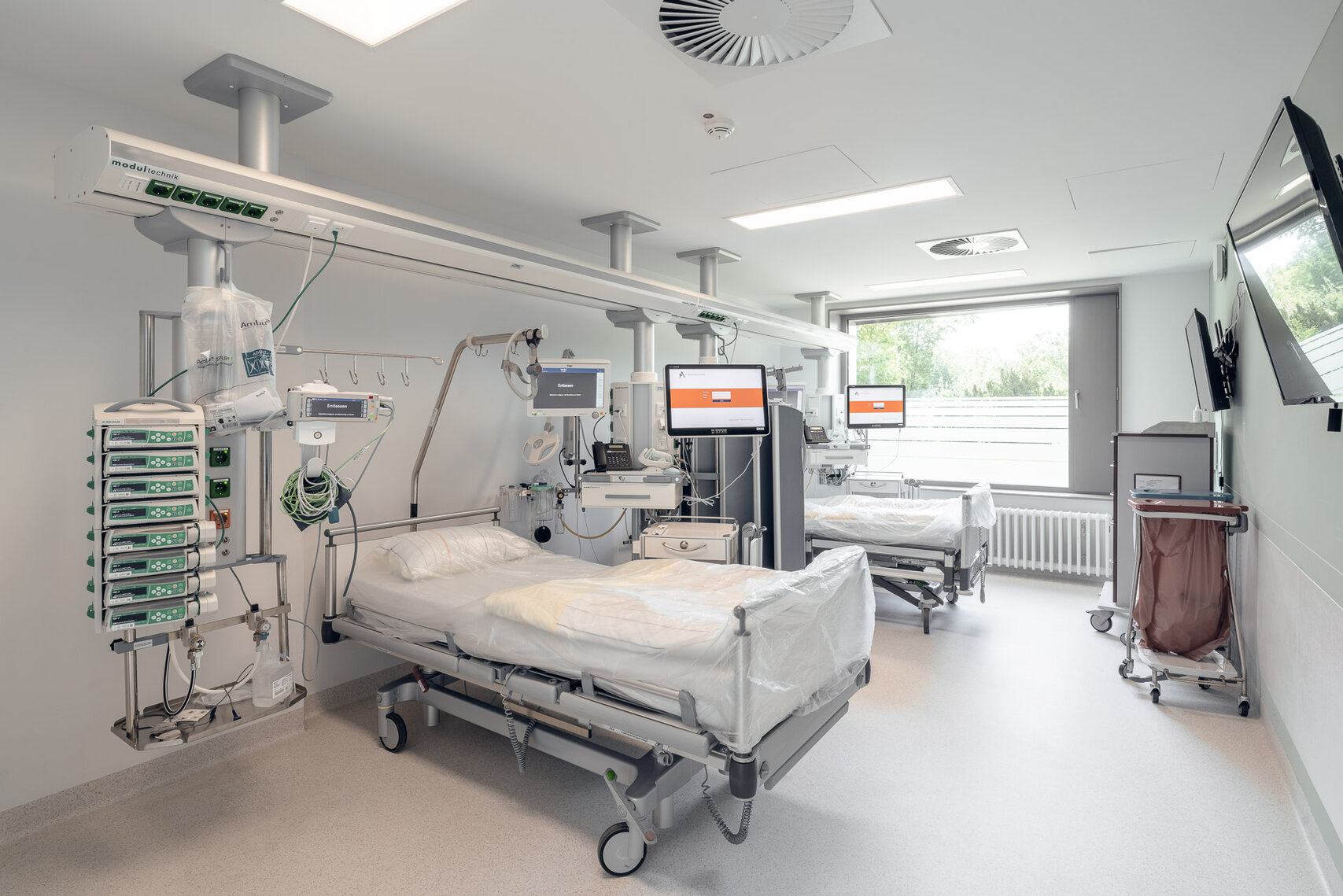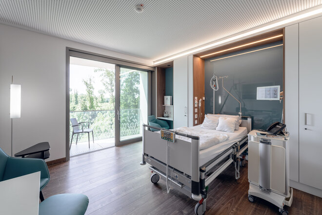Die Patientenzimmer sind zum Wald und Park, sowie zum großzügigen Innenhof orientiert. Dies verspricht eine positive, die Heilung unterstützende Atmosphäre. Insgesamt entstehen 192 neue Betten in Ein- und Zweibettzimmern mit unterschiedlichen Ausbau- und Ausstattungsdetails. Um die beiden Innenhöfe sind Arztdienst-, Untersuchungs- und Administrationsbereiche, sowie die Nebenräume für Ver- und Entsorgung und Pflege angeordnet. Neben dem Pflegebereich entsteht eine Intensivstation, eine IntermediateCare-Station, ein moderner Linksherzkathetermessplatz sowie eine Interventionelle Einheit.