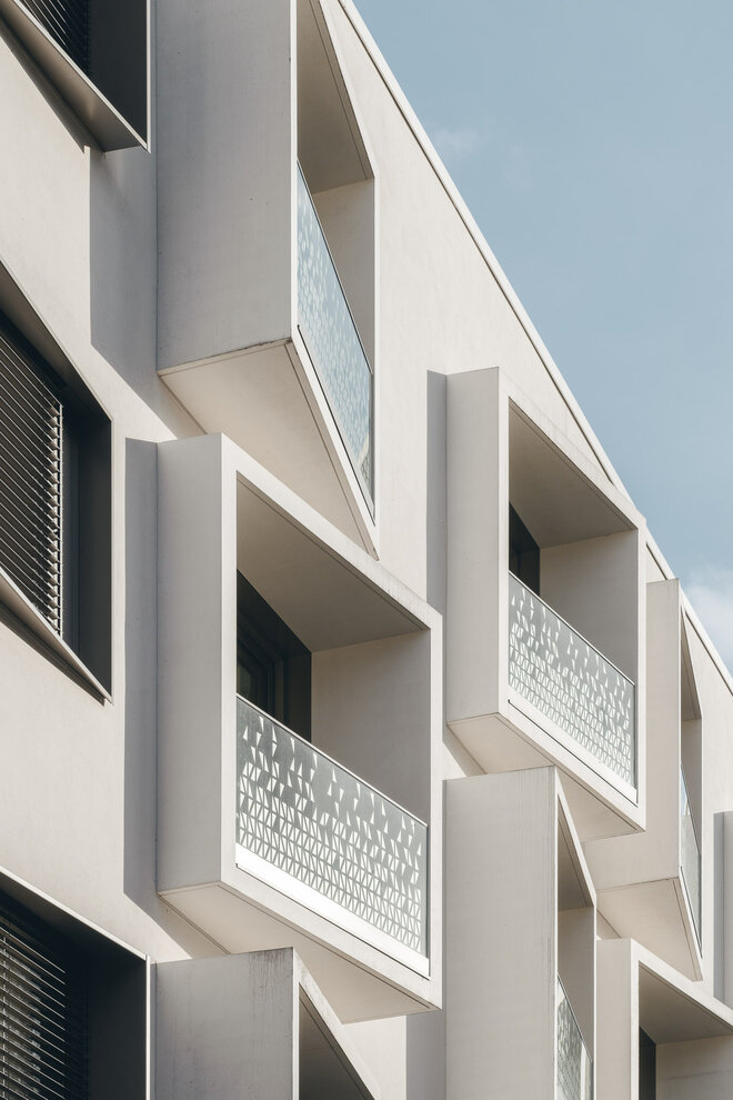 Die Fassade wird mit hochwertigen Materialien als vorgehängte hinterlüftete Fassade mit skulpturalen Elementen realisiert. Ein gleichmäßiges und glattes Strukturbild durch einen Glattputz entsteht, der gleichzeitig wartungsfreundlich ist. Für die Patienten der Komfortzimmer werden Loggien montiert. Diese aus weißem Sichtbeton bestehenden Fertigteile bieten eine Sitzgelegenheit für die Patienten und deren Besucher und stellen gleichzeitig ein Ordnungsprinzip der Fassade her. Durch Abschrägungen entsteht ein abwechslungsreiches Form- und Schattenspiel und unterschiedliche Blickwinkel und Aussichten. Dem Baukörper wird so eine skulpturale Eleganz verliehen.