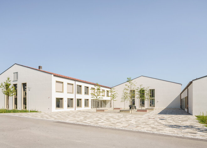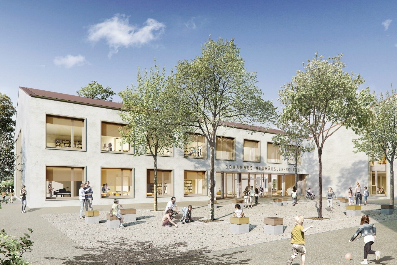 Der Neubau gliedert sich in 3 2-geschossige und einen 1-geschossigen Baukörper, die jeweils an den Giebelseiten über eine Magistrale verbunden sind. Der nördlichste, sowie der 3. Cluster enthalten die 3 Schulstufen und den Werkbereich. Im 2. Cluster sind Aula, Lehrküchen sowie Verwaltung untergebracht. Im südlichsten Cluster befindet sich die Turnhalle und ein Therapiebad mit Nebenräumen.