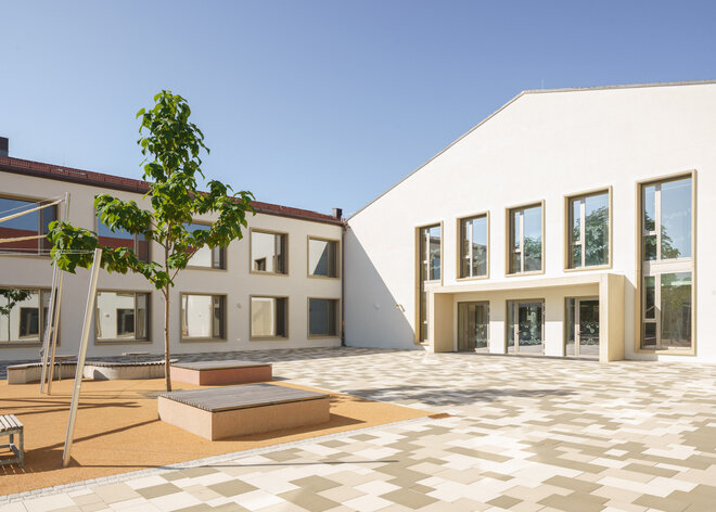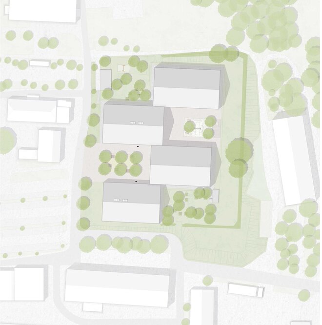 Im südlichsten Cluster sind eine Kleinstfeldhalle, sowie ein Therapiebad, jeweils mit angeschlossenen Nebenräumen vorgesehen. Cluster 4 wird als einziges Bauteil in Teilbereichen unterkellert. Die sich zwischen den Baukörpern öffnenden Räume definieren 4 Höfe. Im nördlichen Hof erhalten die Berufsschüler einen Freibereich. Der mittlere Hof wird als gemeinsamer Hof von Grund- und Mittelschulstufe genutzt. Der 3. Hof, an dem auch der Eingang zum Schulhaus liegt, ist der Haupthof an dem Schüler, Besucher und Lehrer ankommen. Der südlichste Hof wird mit versch. Pflanzbeeten und einem Pizzaofen für die Schüler ausgestattet.