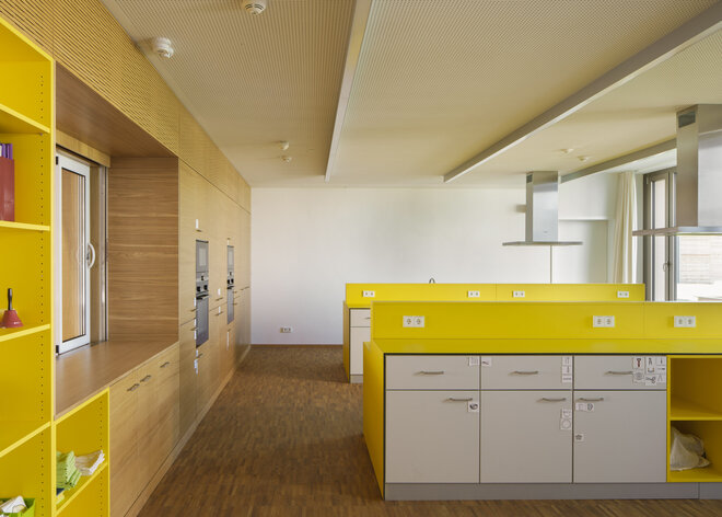 In den Schulclustern sind die Unterrichtsräume zu den äußeren Fassaden hin orientiert. In der Mittelspange werden Bäder, Abstellräume, sowie die Garderoben untergebracht.