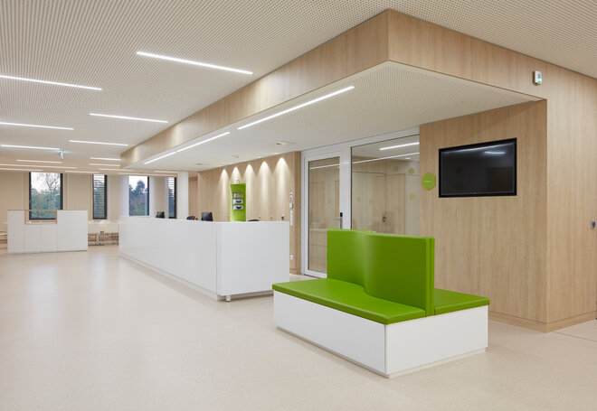 Der Haupteingang mit Empfang und Aufnahme wurde als großzügiger Eingangsbereich mit einem hellen Verbindungsgang zum Neubau umgestaltet. Der Baukörper samt Erschließung ist so konzipiert, das zukünftige Erweiterungen möglich sind. In den Zimmern mit moderner Ausstattung und harmonisch beruhigenden Farbakzenten und warmen Holztönen können insgesamt 88 Patienten betreut und behandelt werden.