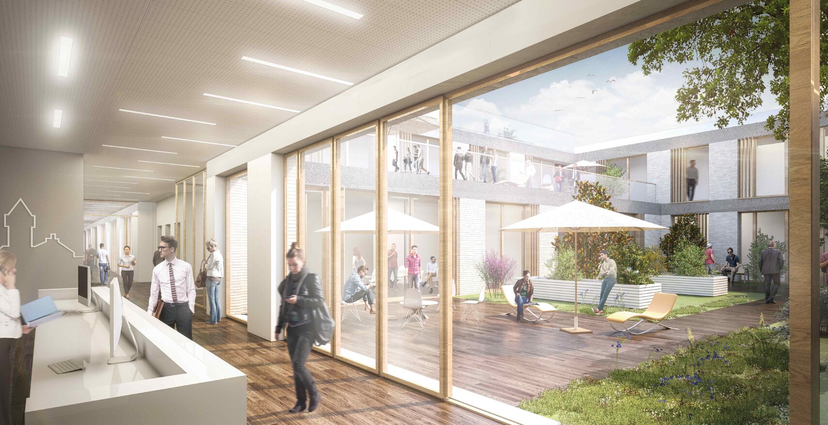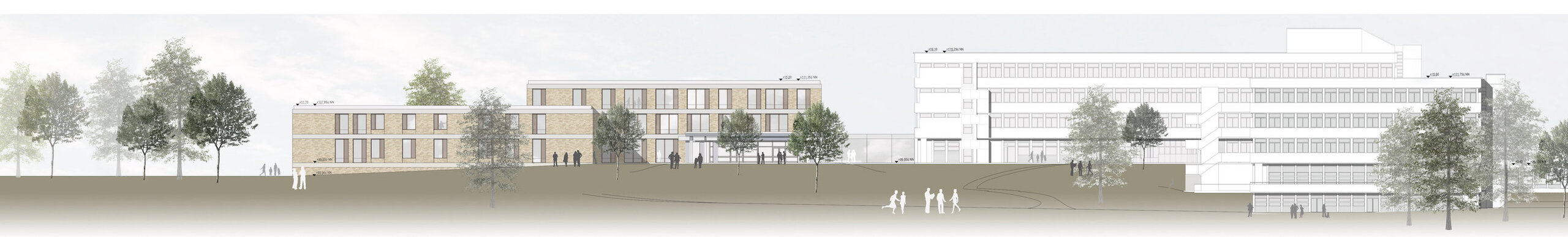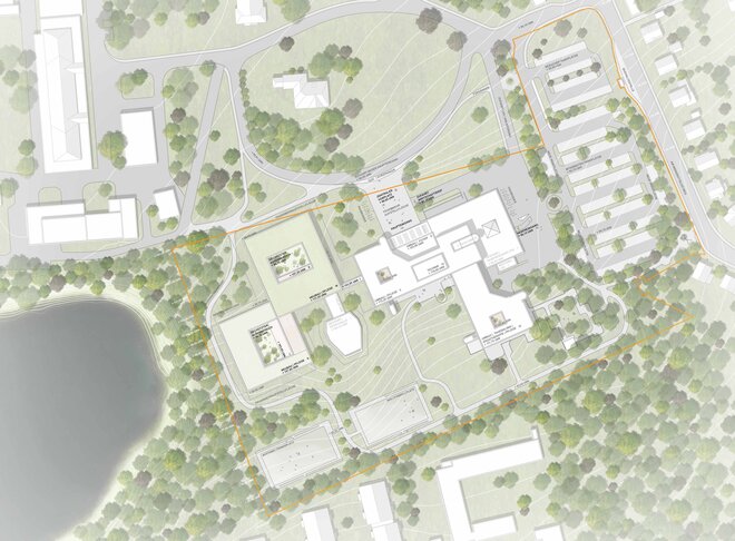 Die städtebauliche Leitidee von a|sh architekten schafft einen neuen zentralen Haupteingang in der Ebene 1 und öffnet somit die Klinik ebenerdig zum Landschaftspark und den denkmalgeschützten Gebäuden. Durch die neue Orientierung bindet sich das Hauptgebäude in die gesamte städtebauliche Struktur ein. Der neue Haupteingang schafft gleichfalls eine Verbindung zwischen dem Hauptgebäude und dem Neubau. a|sh architekten schlagen zwei quadratische Baukörper mit je einem großen Innenhof vor. Die Innenhöfe bieten den Patienten einen Rückzugsraum, welche den Heilungsprozess unterstützten.