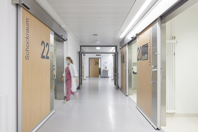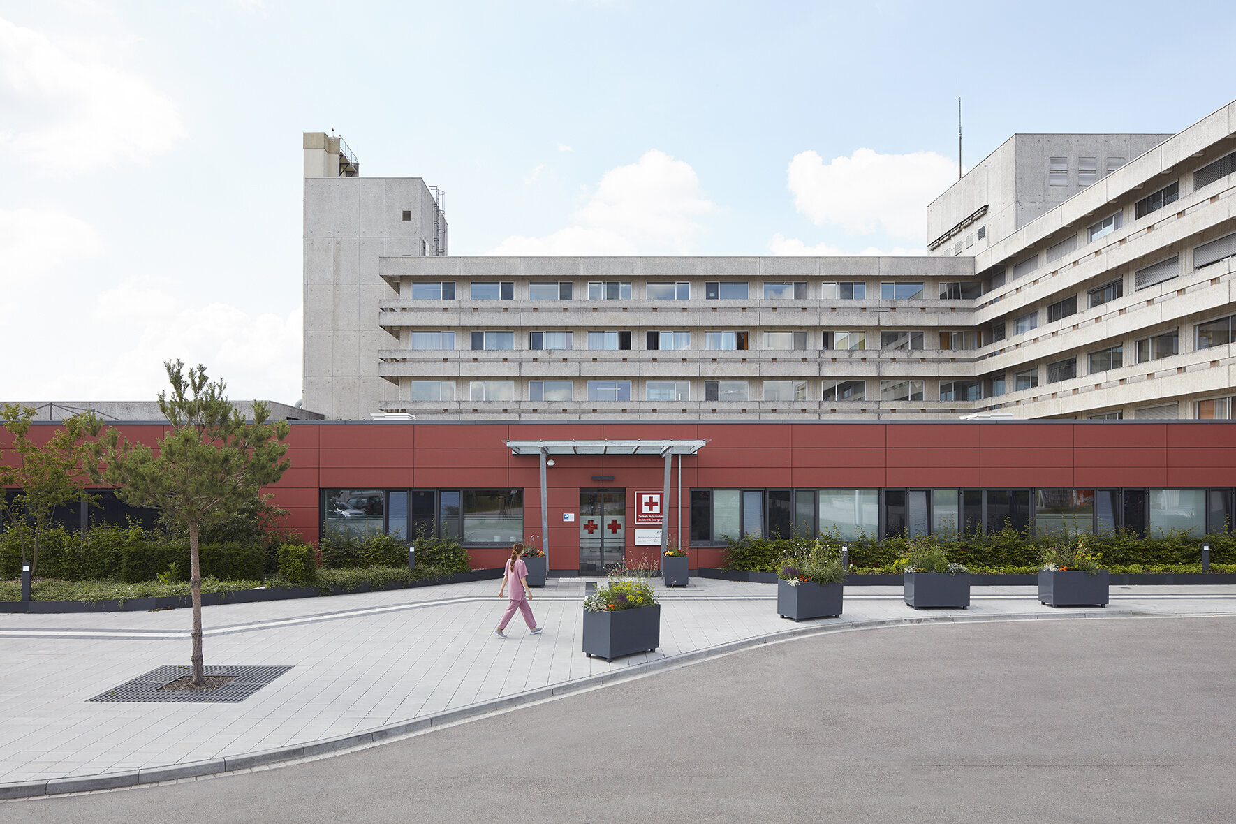 Die Haupterschließung erfolgt über den Haupteingang bzw. die bestehende Aufzugsgruppe im Kern des Hauptbaukörpers. Im Bereich des Bestandes befinden sich zusätzliche Zugänge. Von hier aus werden die Gesamtbauteile über Aufzugsgruppen, sowie die Treppenhäuser vertikal erschlossen. Die Notaufnahme kann sowohl über eine Liegendkrankenvorfahrt als auch über den Haupteingang erreicht werden.